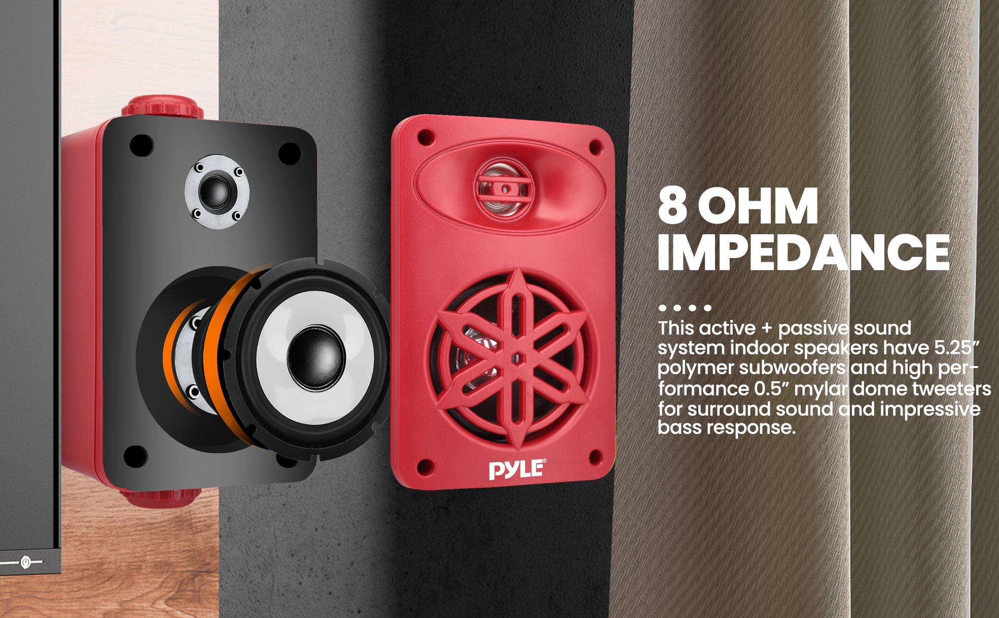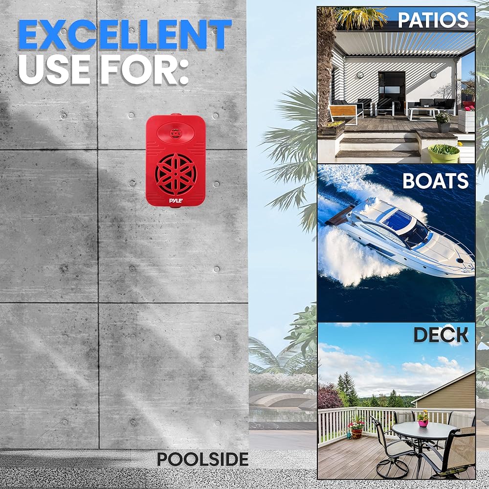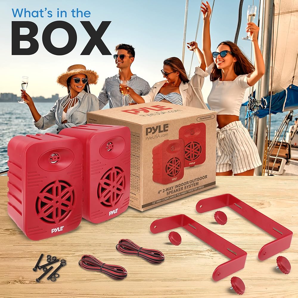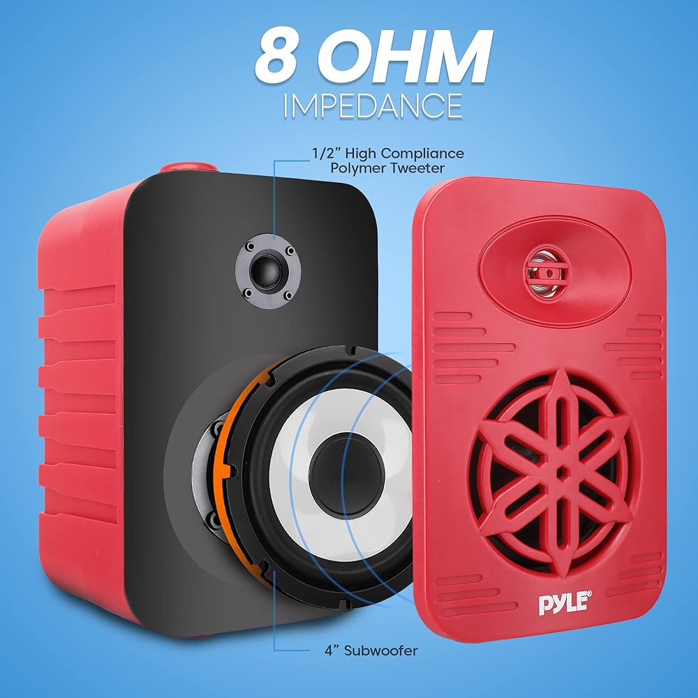 زوج مكبرات صوت داخلية وخارجية من PyleUsa - نظام مكبر صوت مزدوج مقاوم للماء 300 وات 4 بوصات ثنائي الاتجاه مع مكبر صوت بوليمر عالي التوافق 1/2 بوصة - في المنزل، القارب، البحرية، سطح السفينة، الفناء، بجانب حمام السباحة (أحمر)