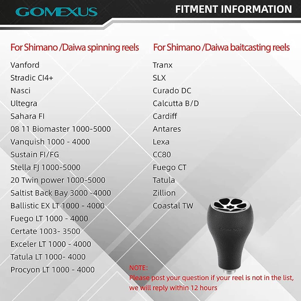 The Gomexus TPE knob feels non-slip, and improves the overall comfort and performance of your reel, making you want to fish even more. Features 【More Grip】TPE knob is a large, ergonomically shaped knob with a bit of concave to cradle the thumb that gives anglers extra grip when grinding in big bass. 【 Better Control for big baits】Knobs help eliminate the slip that some experience with the rounder knobs. 【Sufficient Accessories】Everything you need includes Japanese NMB bearings, which can last longer and are sensitive to feel bait action underwater. Don't throw the box. Accessories are at the bottom.
