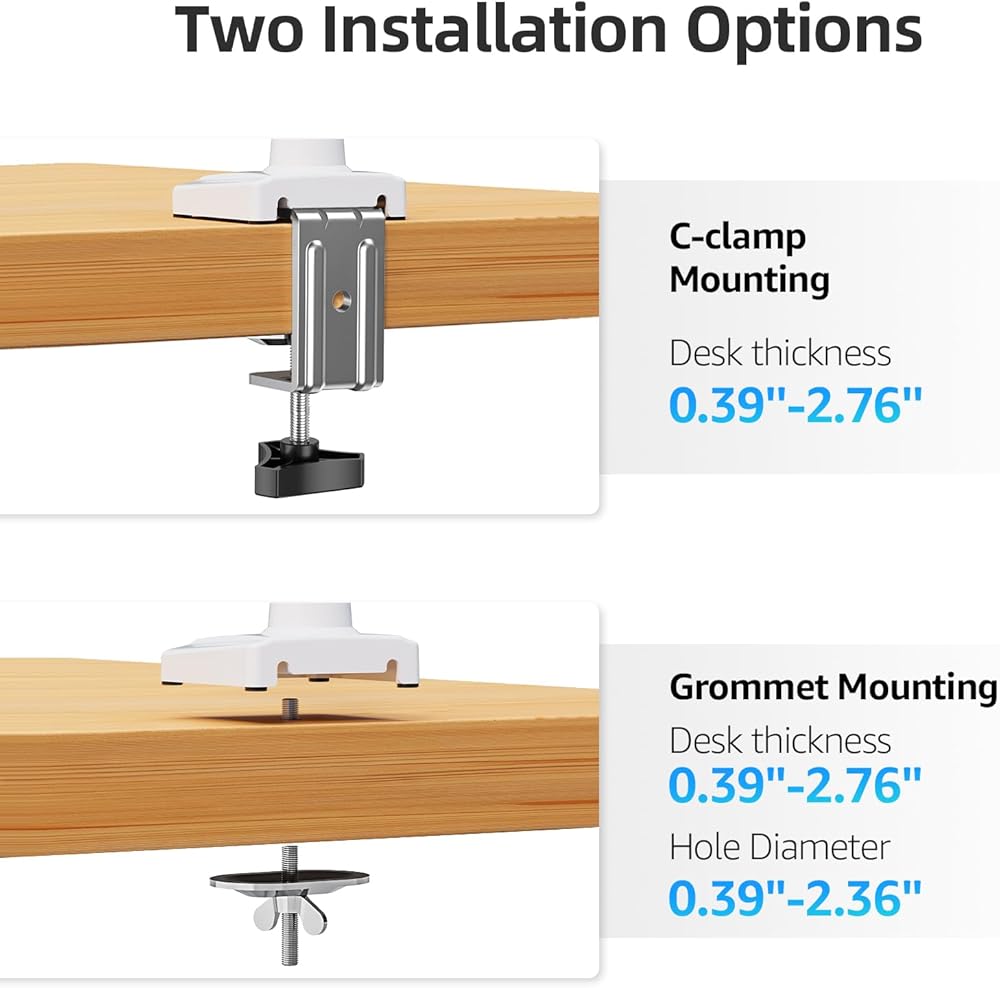 • خياران للتركيب: يأتي حامل الشاشة هذا للمكتب مزودًا بمشبك على شكل حرف C خالي من الحفر وقاعدة معدنية، ومكاتب مناسبة بسُمك من 0.39 بوصة إلى 2.76 بوصة. إن التعليمات سهلة الاتباع والأجهزة المضمنة تجعل التثبيت سريعًا وبسيطًا — أقل من 15 دقيقة للإعداد! مثالي للمحترفين المشغولين الذين يحتاجون إلى حل ذراع شاشة خالٍ من المتاعب. إذا كان سمك مكتبك ليس ضمن هذا النطاق، فيرجى التواصل معنا للحصول على المشبك C المناسب.