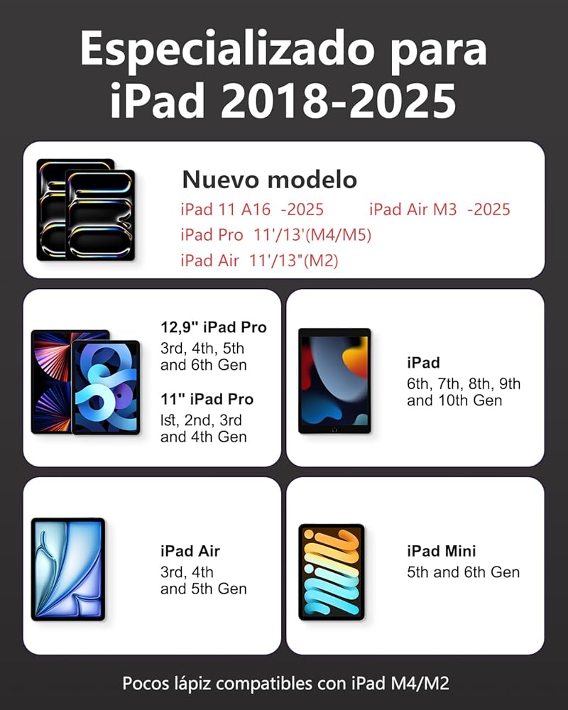 متوافق مع IPAD 2018-2024 - قلم ستايلس لجهاز iPad متوافق مع iPad 6/7/8/9/10، iPad Mini 5/6، iPad Air 3/4/5، iPad Air M2 (11 بوصة/13 بوصة)، آيباد برو 11 بوصة (1/2/3/4)، آيباد برو 12.9 بوصة (3/4/5/6)، آيباد برو M4 (11 بوصة/13 بوصة). نصيحة: قلم رصاص برو لجهاز iPad غير متوافق مع أجهزة iPad موديل 2017 والإصدارات الأقدم والعلامات التجارية الأخرى للأجهزة اللوحية. غير متوافق مع الأجهزة الأخرى مثل الهواتف المحمولة وأجهزة الكمبيوتر المحمولة.