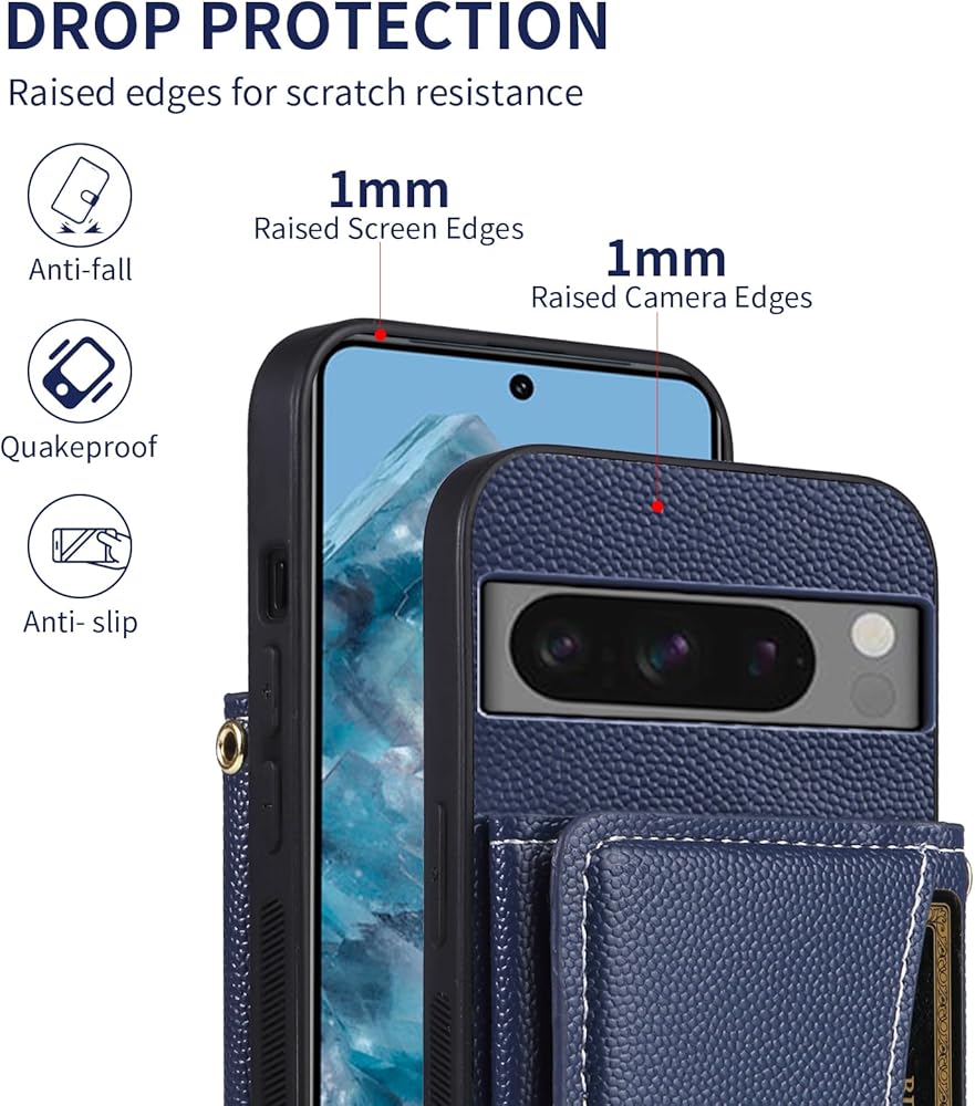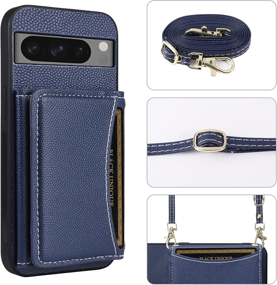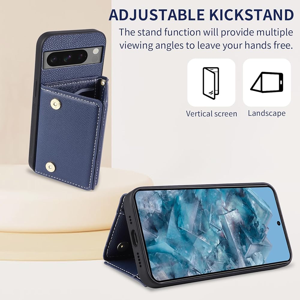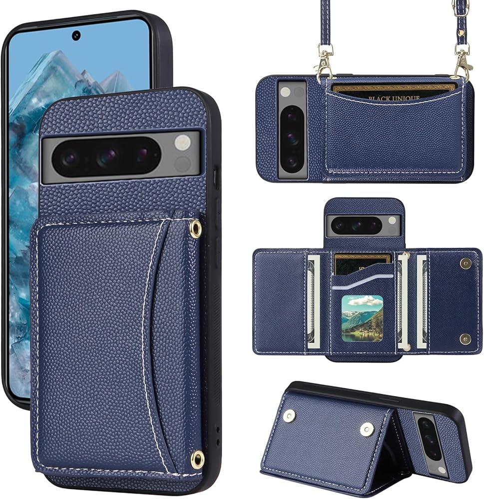 【Compatible Models】: Compatible with Google Pixel 8 Pro. NOT compatible with other devices. 【Card Holder】: 5 card slots + 1 cash bag securely hold your cards and some cash without taking wallet outside Great for shopping, daily city walks, traveling and so much more.Plus, Featuring a flap closure with a magnetic snap to secure it in place, this wallet case will keep all your belongings safely in place. 【Crossbody Shoulder Strap】: With an adjustable shoulder strap, you can also adjust it to your preferred length or even wear it as a crossbody bag for a different look.Beside,3 lanyard holes on this wallet case,which means it has two different ways of wearing. 【KickStand】: It could be a kickstand or holder for converting into a multi-angle comfortable view for Reading,Watching Movies,Playing Games and Browsing the Web.