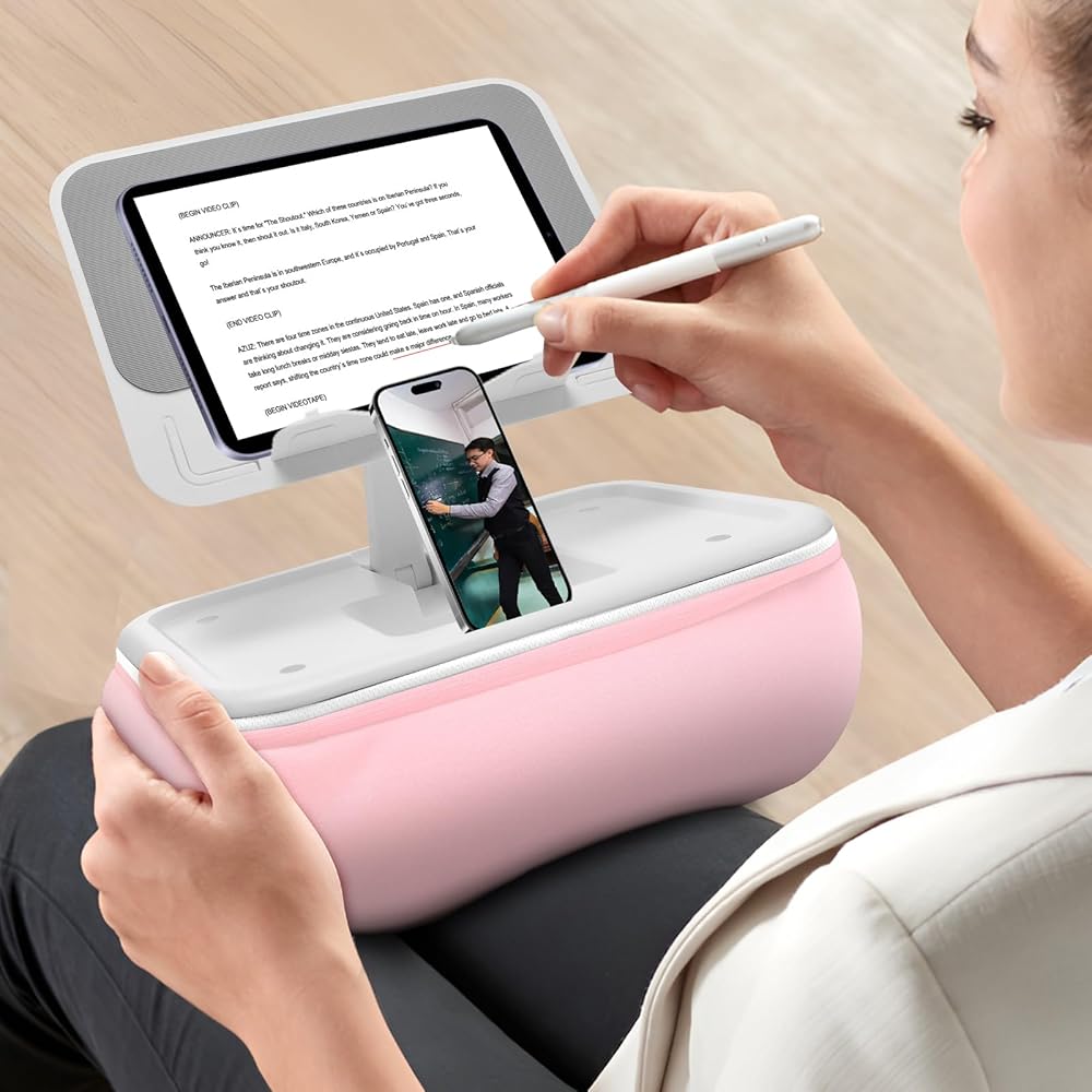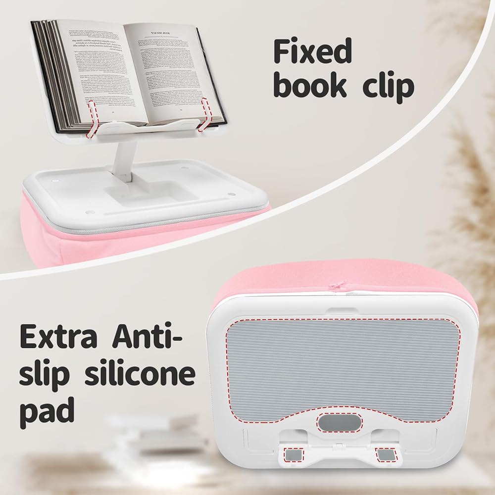 زوايا وارتفاعات قابلة للتعديل بحرية - يحتوي حامل الوسادة هذا على نقطتي اتصال قابلتين للتعديل، مما يسمح لك بضبط الجهاز اللوحي على زاوية الرؤية التي تحتاجها. بالإضافة إلى ذلك، فهو يأتي مع مشبكين مخفيين للكتب، بحيث يمكن وضع معظم الكتب على الحامل، مما يتيح لك الاستمتاع بالقراءة بشكل كامل.