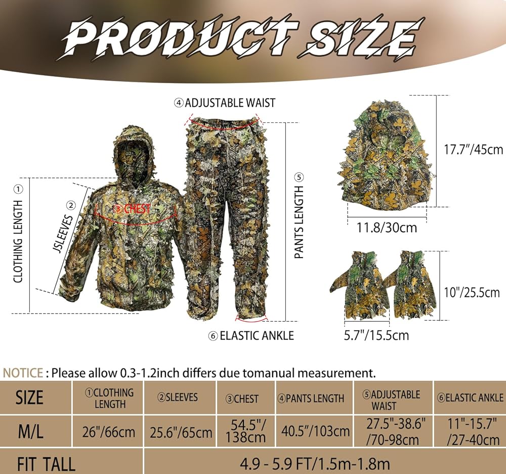 【تصميم قابل للتعديل】 مقاس البدلة: F (الارتفاع الموصى به 4.9-5.9أقدام، الوزن 40-90 كجم). السترة المزودة بسحاب لبدلة غيلي تجعل من السهل ارتداؤها وخلعها. سلك نايلون قابل للتعديل على القبعة يمكنه إصلاح القبعة بشكل أفضل. تم تصميم أرجل البنطال وخصره بإغلاق مرن، وخصر البنطال مزود برباط يمكن تعديله بحرية وفقًا لمقاس خصرك.