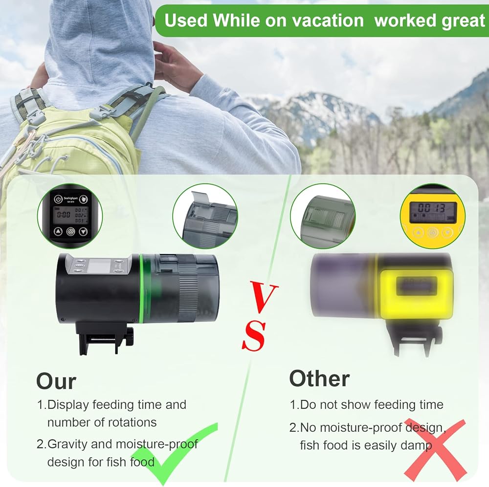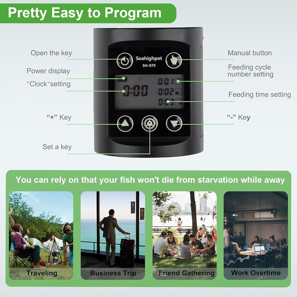 شكرًا لاختيارك جهاز تغذية الأسماك الأوتوماتيكي من سي هاي بيت جهاز تغذية الأسماك القابل للبرمجة للعطلات يعتمد على شاشة رقمية LCD. يمكنك ضبط وقت التغذية ومراقبة مستوى البطارية في أي وقت. وهذا يجعل البرمجة أسهل. ونحن نستخدم تصميم مقاوم للرطوبة بمستشعر الجاذبية. عندما يصل الطعام إلى القاع، سيتم فتح مخرج الطعام للتغذية. إنه فعال للغاية عند السفر أو العطلة أو السفر أو العمل لوقت إضافي.