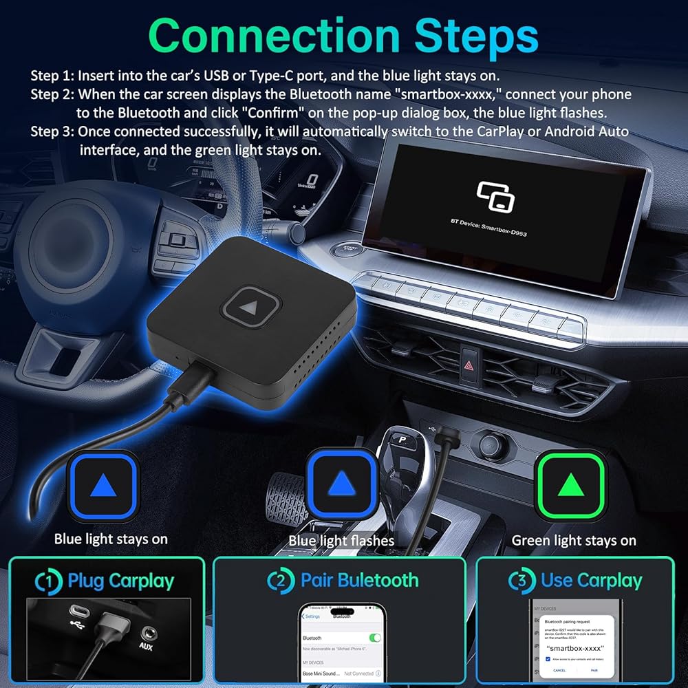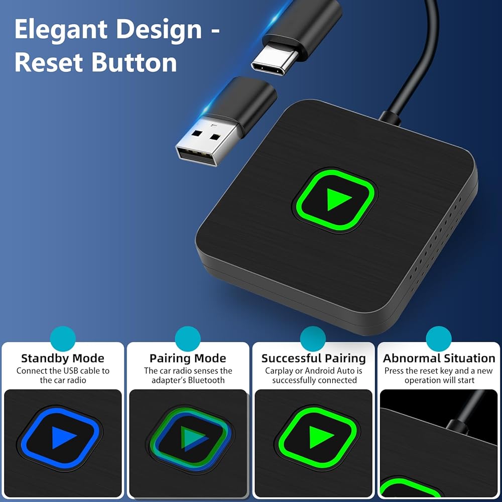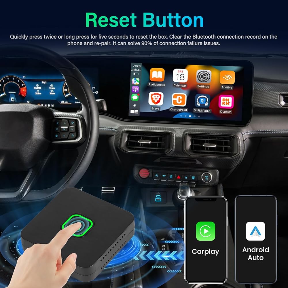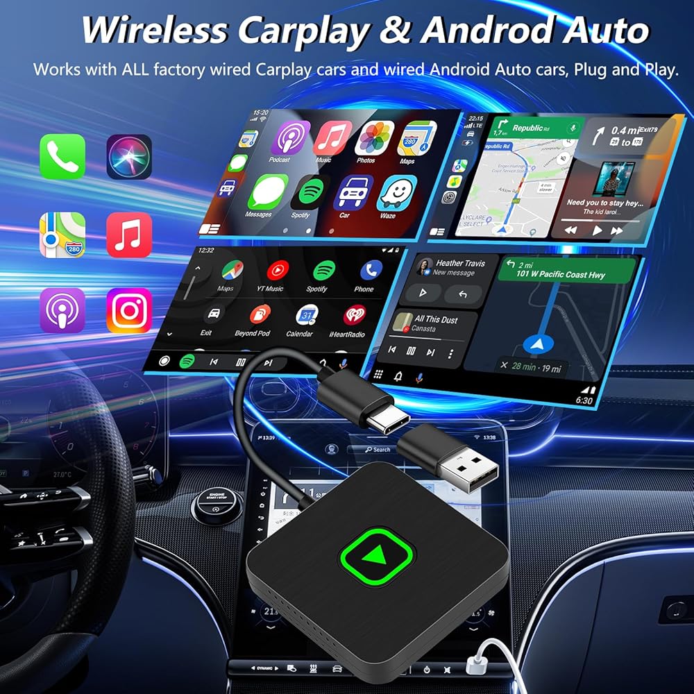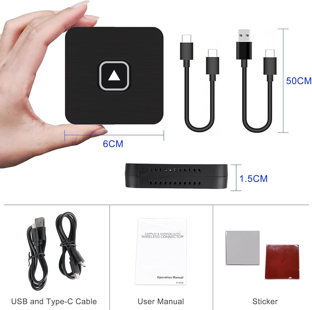 • اتصال لاسلكي سلس: قل وداعًا للكابلات! استمتع بـ CarPlay وAndroid Auto اللاسلكي مع المحول الخاص بنا، مما يسهل الوصول إلى التنقل والموسيقى والمكالمات مباشرة من لوحة أجهزة القياس في سيارتك دون متاعب توصيل هاتفك