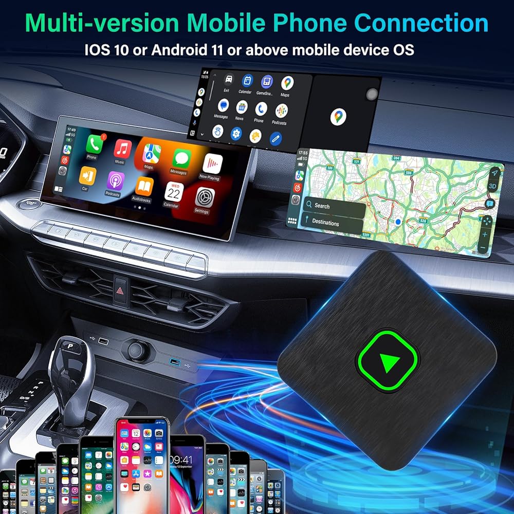 • التوافق العالمي: يتوافق المحول الخاص بنا مع كل من أجهزة iPhone (iOS 10 أو أعلى) وAndroid (Android 11 أو أعلى). وهو يدعم مجموعة واسعة من موديلات السيارات المجهزة بأنظمة CarPlay أو Android Auto المثبتة في المصنع