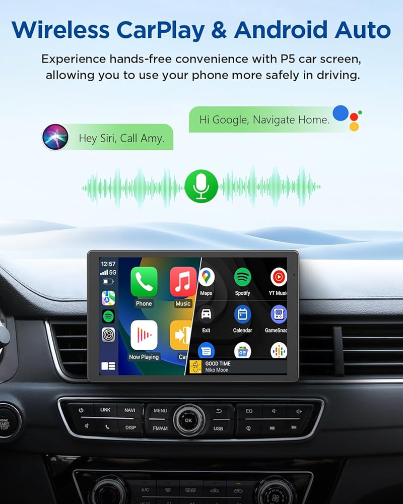 【CarPlay اللاسلكي وAndroid Auto】تمتع براحة بدون استخدام اليدين مع ستيريو السيارة المحمول P5! ما عليك سوى توصيل هاتفك الذكي بجهاز استقبال السيارة P5 عبر البلوتوث للوصول إلى التحكم الصوتي من خلال Siri أو Google Assistant. استمتع بالتحكم السلس في الموسيقى والملاحة والمكالمات الهاتفية والرسائل، مما يعزز السلامة والراحة أثناء القيادة.