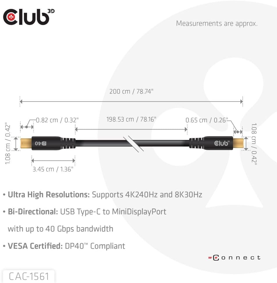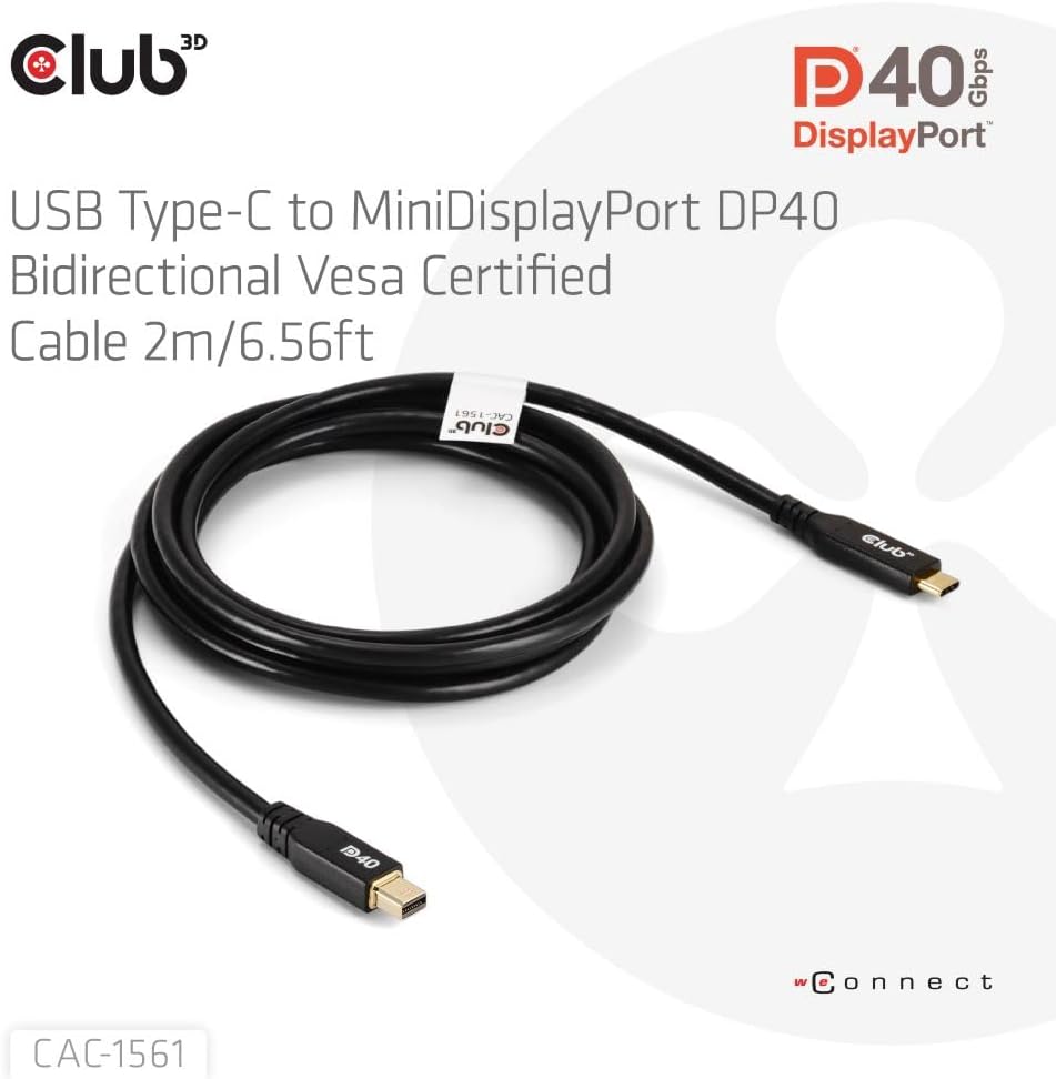 كابل Club 3D CAC-1561 USB من النوع C إلى Mini DP 2.1 كابل معتمد ثنائي الاتجاه VESA DP40 M/M 2m/6.56ft
