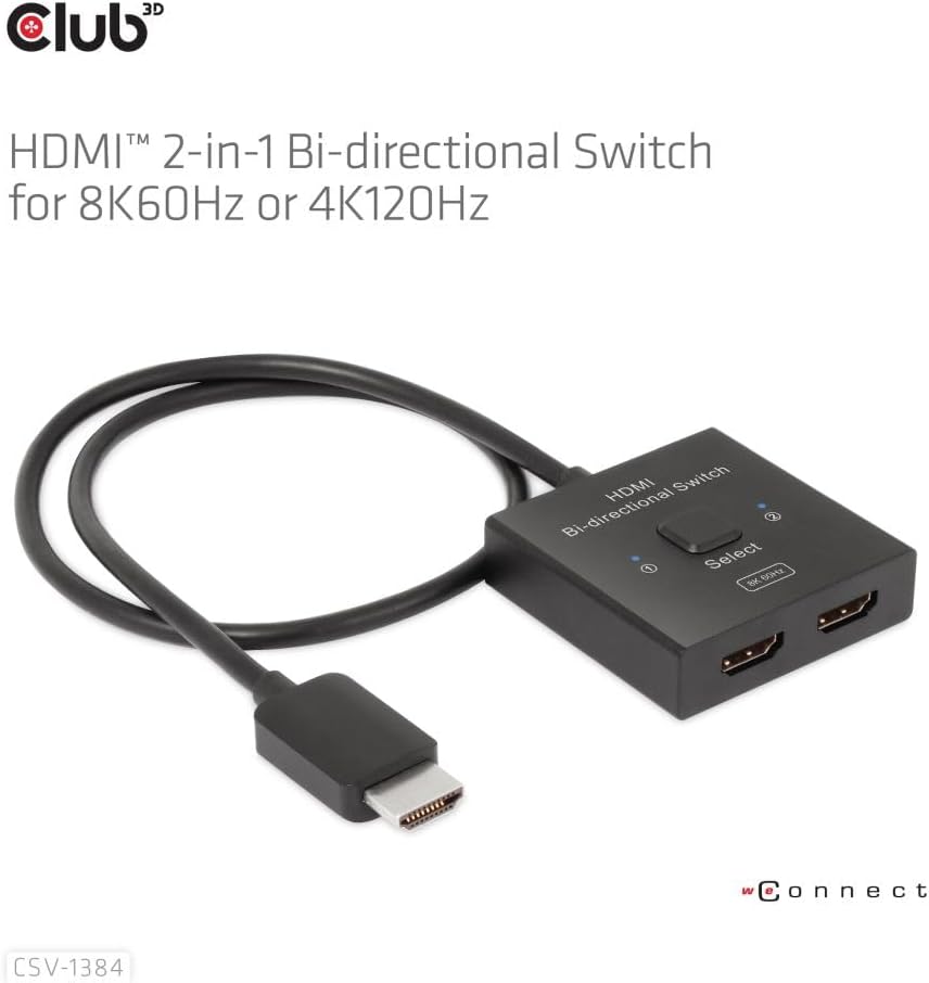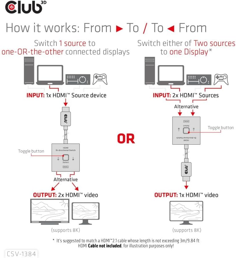• BI-DIRECTIONAL HDMI SWITCH: Seamlessly switch between two HDMI sources or connect a single source to two displays with the Club 3D CSV-1384 hdmi bi-directional switch, offering versatile and flexible connectivity. It can switch either of two sources to one display or switch one source to either of two displays