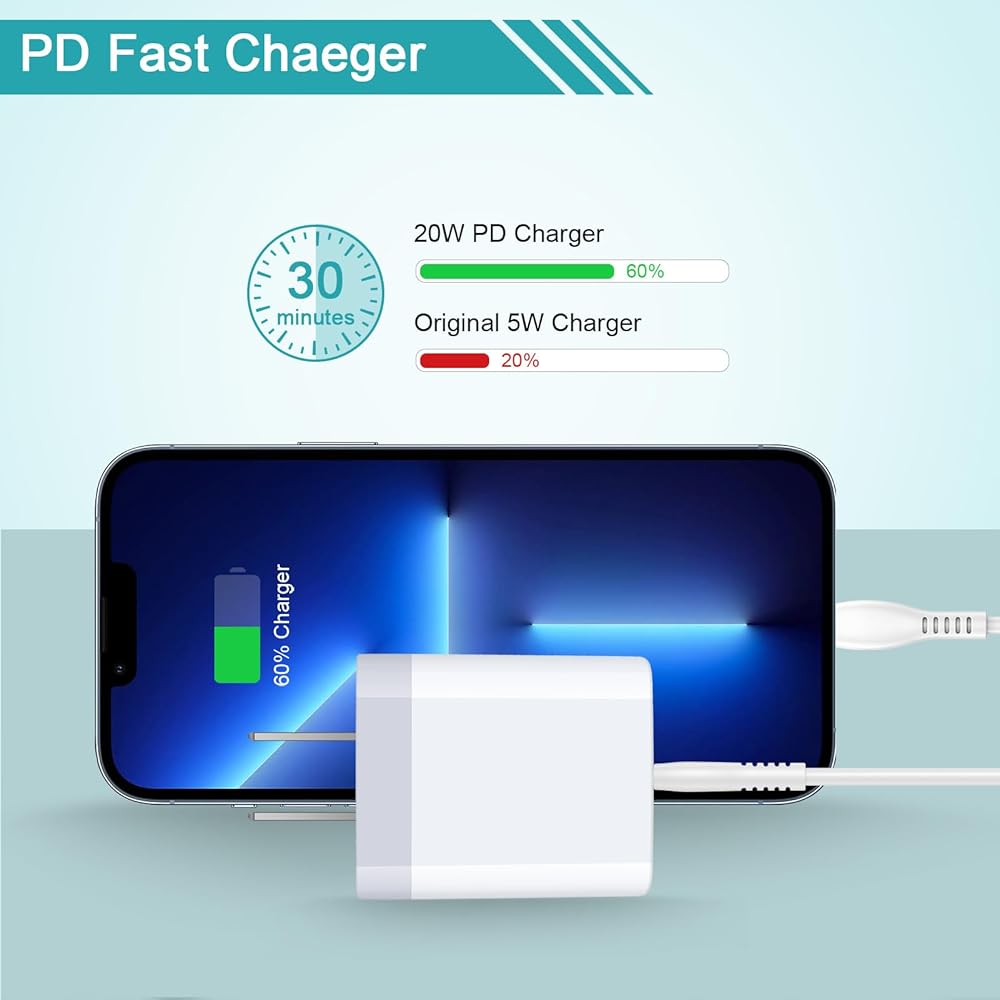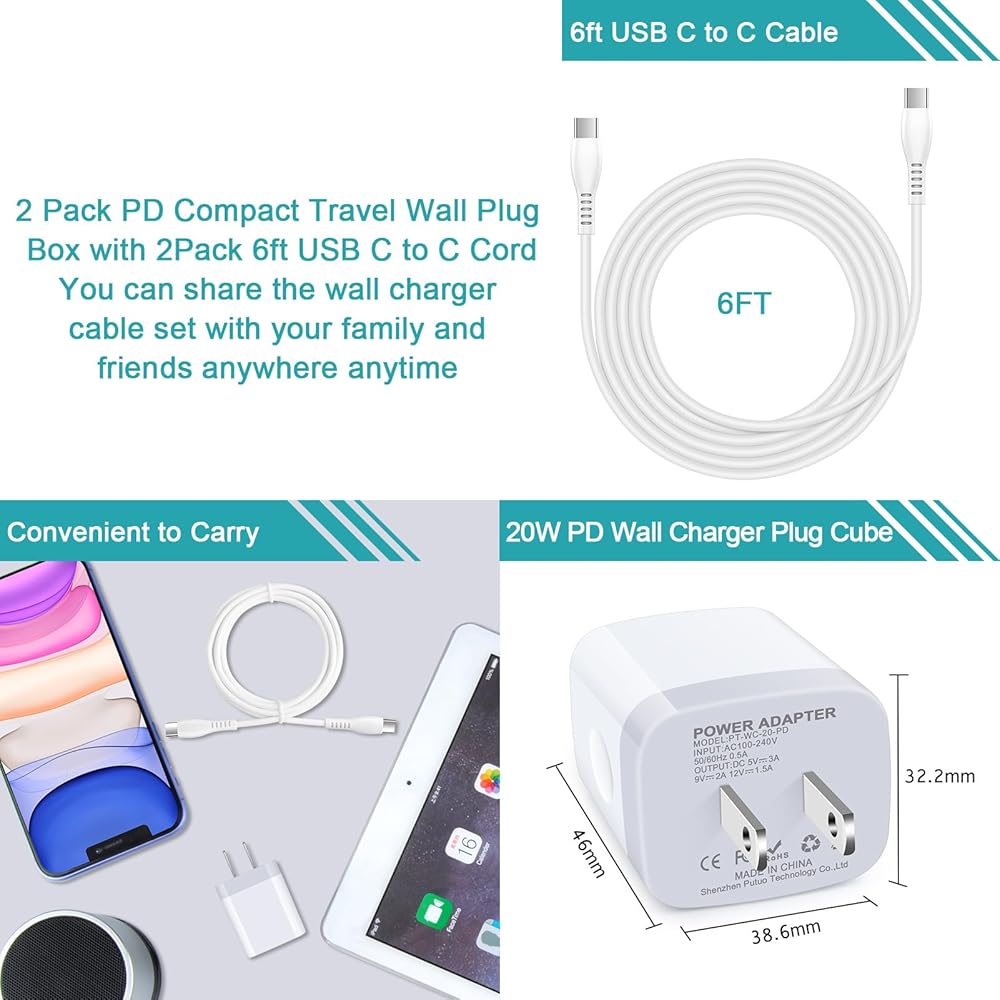 【ما تحصل عليه: شاحن حائط PD USB C بقدرة 20 وات وكابل USB C إلى USB C بطول 6 أقدام.