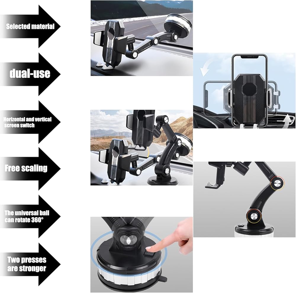 Widely Used: This mobile phone holder is suitable for most cars, SUVs, etc. It can be used on dashboards and windshields. It can be placed horizontally or vertically. Navigation is not restricted. You can adjust the angle you like as you like. It does not block the use of car buttons and does not block driving sight, providing you with a better driving experience.