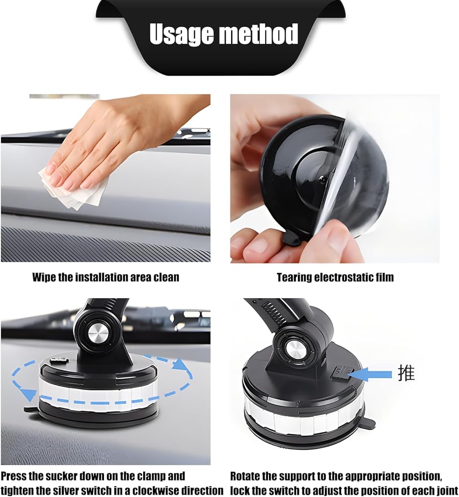 Enlarged Suction Cup Design: Upgraded large suction cup design, 3.3" diameter, stronger suction power, realizes vacuum suction, washable. When using, clean the installation position, press the suction cup down and tighten it, tighten the silver switch clockwise, rotate the bracket to the appropriate position, lock the switch.