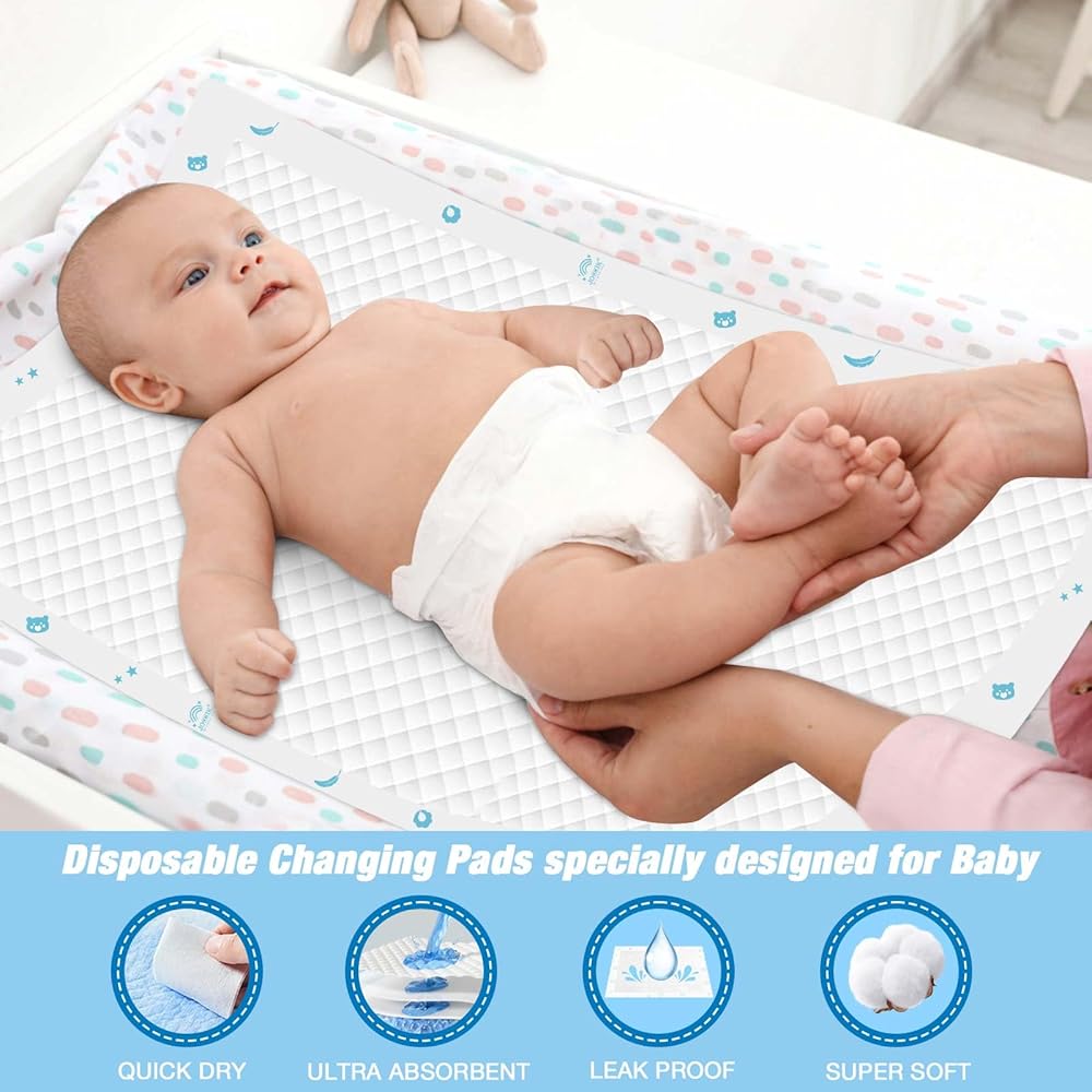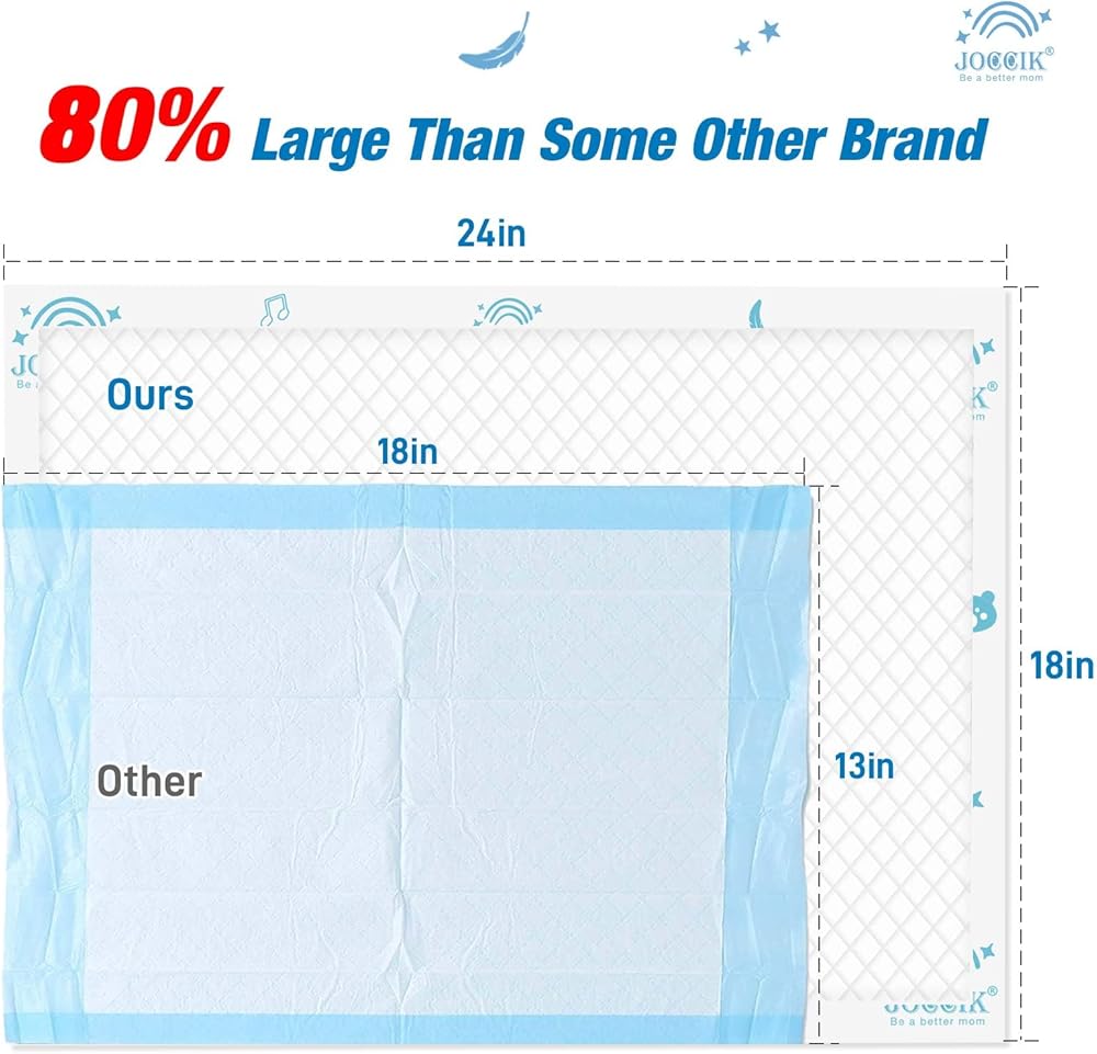 DOUBLE PROTECTION: For better absorption, we've 15% thicker the disposable changing pads, upholding our commitment to quality, Additionally, the larger size 24 x 18in ensures coverage for changing table or any surface, giving you peace of mind during diaper changes