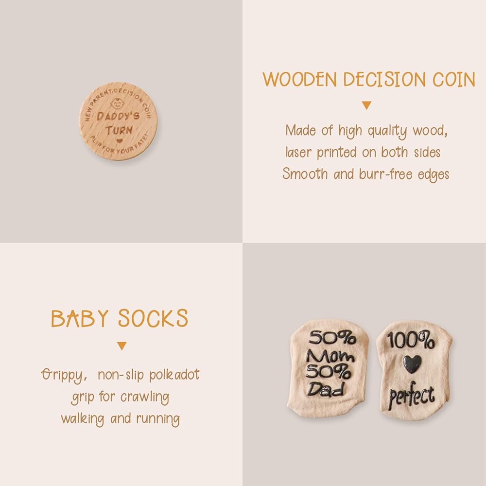 【New Born Baby Girl Boy Gift】Wooden rattle teether toys are made from natural beech wood, with no paint, only sanding. Suitable for baby teething. 100% cotton funny baby cover are designed with fashionable printings, easy to match your baby's outfit, and add more fun to your baby's dressing up. Bring a smile to the face of everyone who sees this - "50% Mom 50% Dad" Say no to boring baby socks!