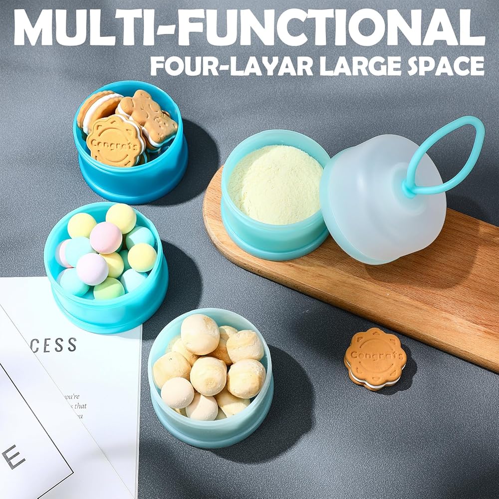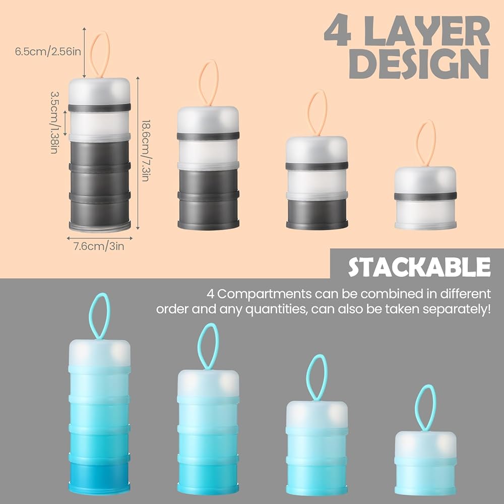 • 4 Layer Design: the travel formula dispenser has 4 compartments, which can be combined in different order and any quantities, and can also be taken separately; You can put quantity of milk powder to be taken at one time in each layer box, you can carry 4 times of milk powder for baby outdoor need, very convenient and practical