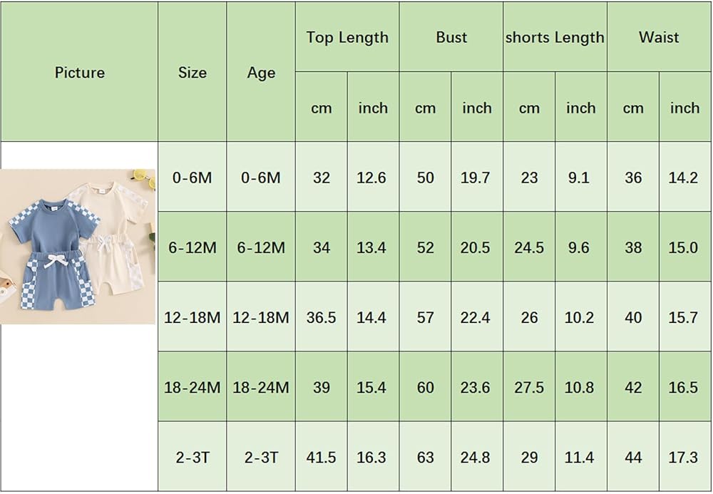 Size (cm) 0-6M Tops Length: 32 Bust: 50 Pants Length: 23 Waist: 36 Advised Age: 0-6 Months 6-12M Tops Length: 34 Bust: 52 Pants Length: 24.5 Waist: 38 Advised Age: 6-12 Months 12-18M Tops Length: 36.5 Bust: 57 Pants Length: 26 Waist: 40 Advised Age: 12-18 Months 18-24M Tops Length: 39 Bust: 60 Pants Length: 27.5 Waist: 42 Advised Age: 18-24 Months 2-3T Tops Length: 41.5 Bust: 63 Pants Length: 29 Waist: 44 Advised Age: 2-3 Years Size (inch) 0-6M Tops Length: 12.6 Bust: 19.68 Pants Length: 9.06 Waist: 14.17 Advised Age: 0-6 Months 6-12M Tops Length: 13.39 Bust: 20.47 Pants Length: 9.65 Waist: 14.96 Advised Age: 6-12 Months 12-18M Tops Length: 14.37 Bust: 22.44 Pants Length: 10.24 Waist: 15.75 Advised Age: 12-18 Months 18-24M Tops Length: 15.35 Bust: 23.62 Pants Length: 10.83 Waist: 16.54 Advised Age: 18-24 Months 2-3T Tops Length: 16.34 Bust: 24.8 Pants Length: 11.42 Waist: 17.32 Advised Age: 2-3 Years Specification Condition: 100% Brand New Material: 95% Cotton 5% Elastane Style: Cool Fashion Gender: Boys Season: Summer Quantity: 2pcs Sleeve: Short Sleeve Pattern: Checkerboard Patchwork Occasion: Daily Package Including: 1* Tops 1* Shorts Note: There may be 1-2 cm deviation in different sizes, locations and stretch of fabrics. Size chart is for reference only; there may be a little difference with what you get. Color may be lighter or darker due to the different PC display. Promise If the product has any quality problems, please feel free to contact us, we will help you solve the problem as quickly as possible.