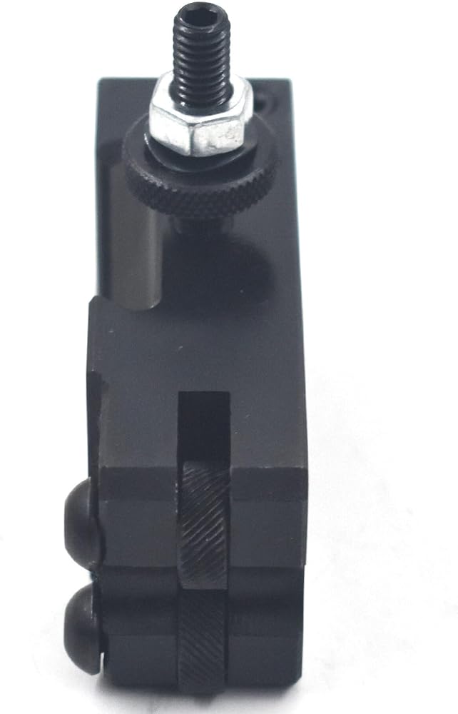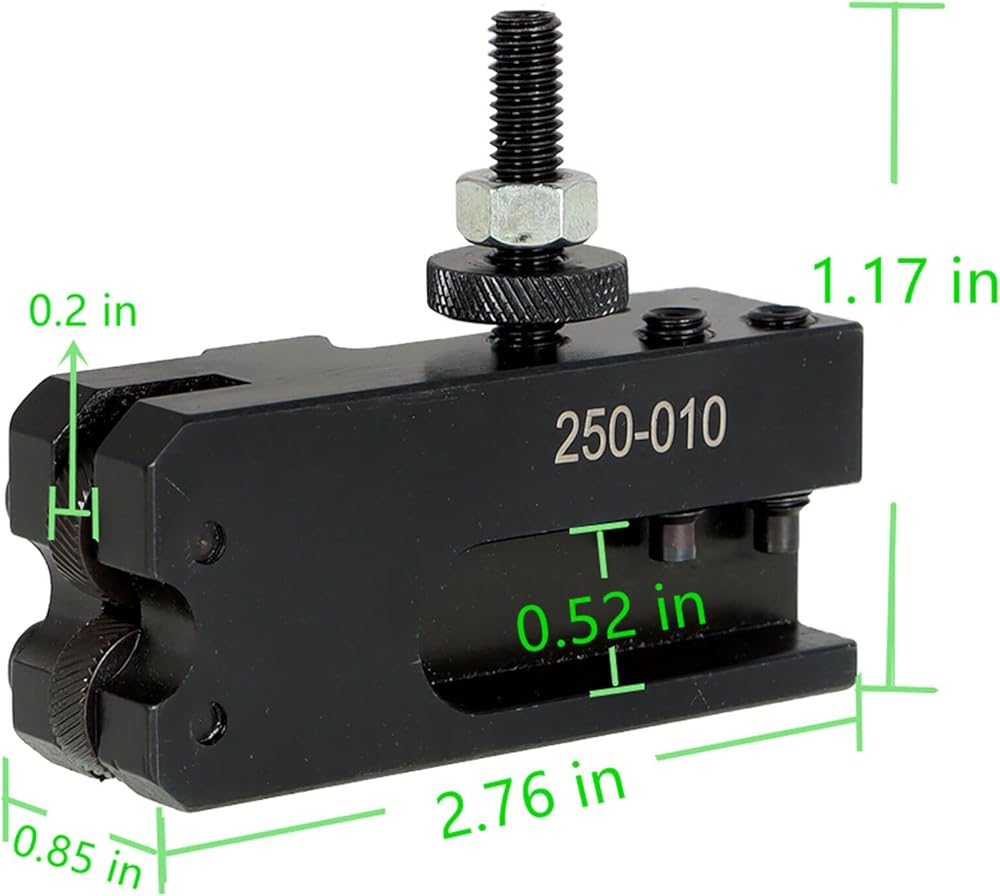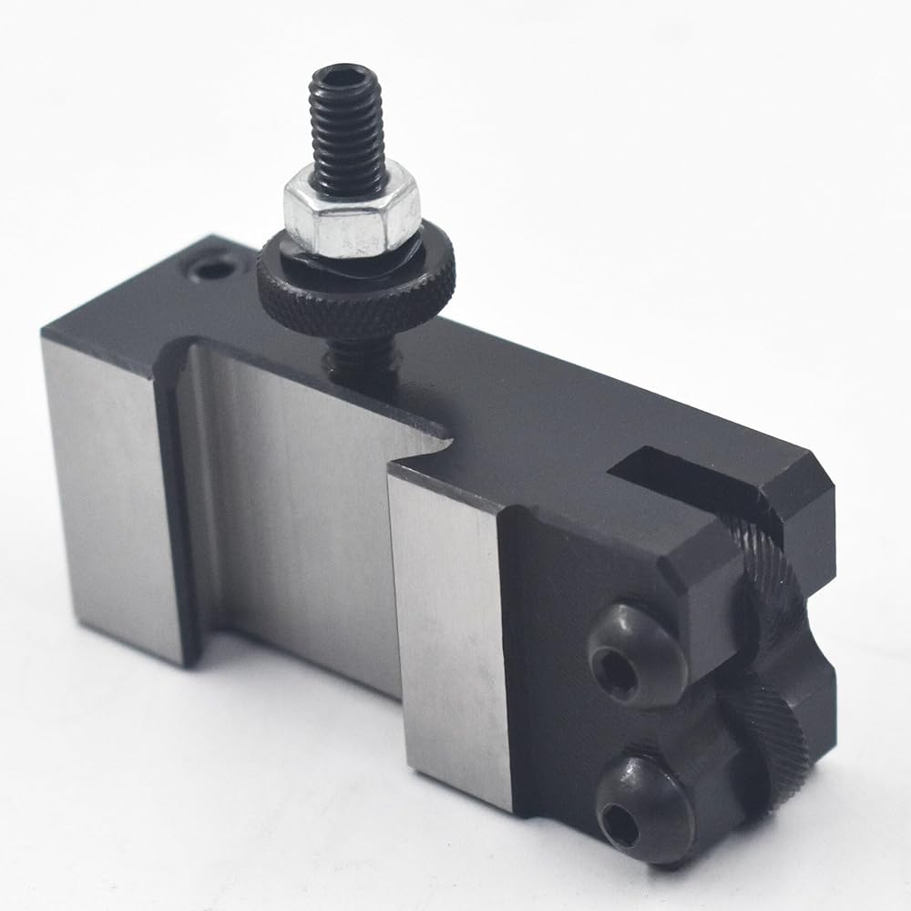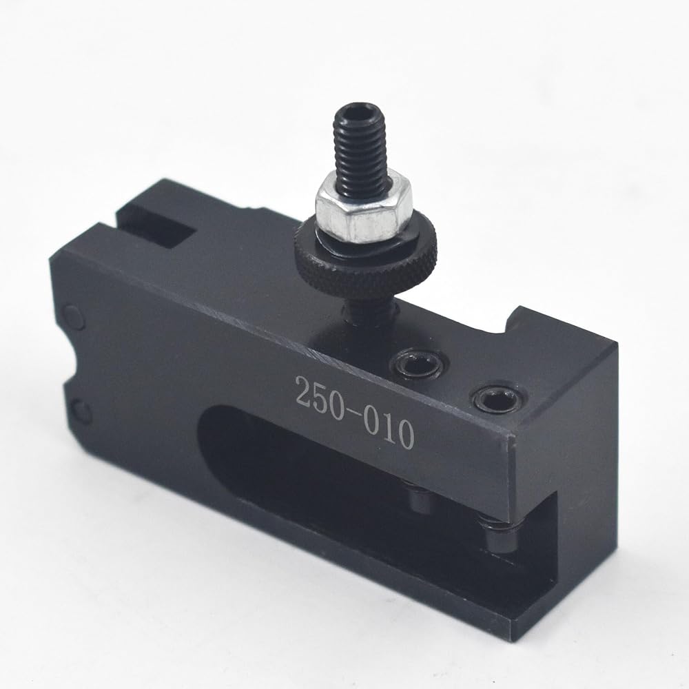 250-010 knurling, turning & facing holder is made from high quality, heat treated tool steel. Quick change turning have the maximum rigidity to get the chatter free performance. Quickly and easily installed on an engine, bench, or turret lathe for a wide range of operations.The tool post comes with a blank T-Nut plate, the customer have to do some machining work to make it fit into their own specific lathe T slot.Tool bit capacity: use tool bit up to 1/2" square diameter tool bitsPacadge included1PC 250-010 knurling and turning tool holder