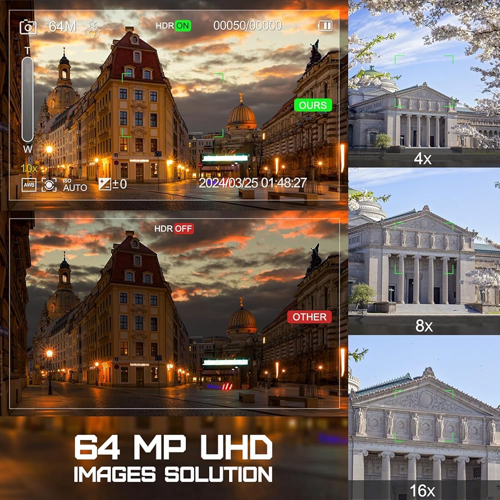• تصوير عالي الدقة: تم تجهيز الكاميرا الرقمية المتطورة من NBDDIGITAL بمعالج IMX CMOS المتقدم ومستشعر 1/2 بوصة، مما يضمن الحصول على صور مذهلة عالية الوضوح بدقة 64 ميجابكسل. سواء كنت مصورًا مبتدئًا أو متمرسًا، توفر NBDDIGITAL إمكانات تصوير احترافية للحصول على نتائج استثنائية.