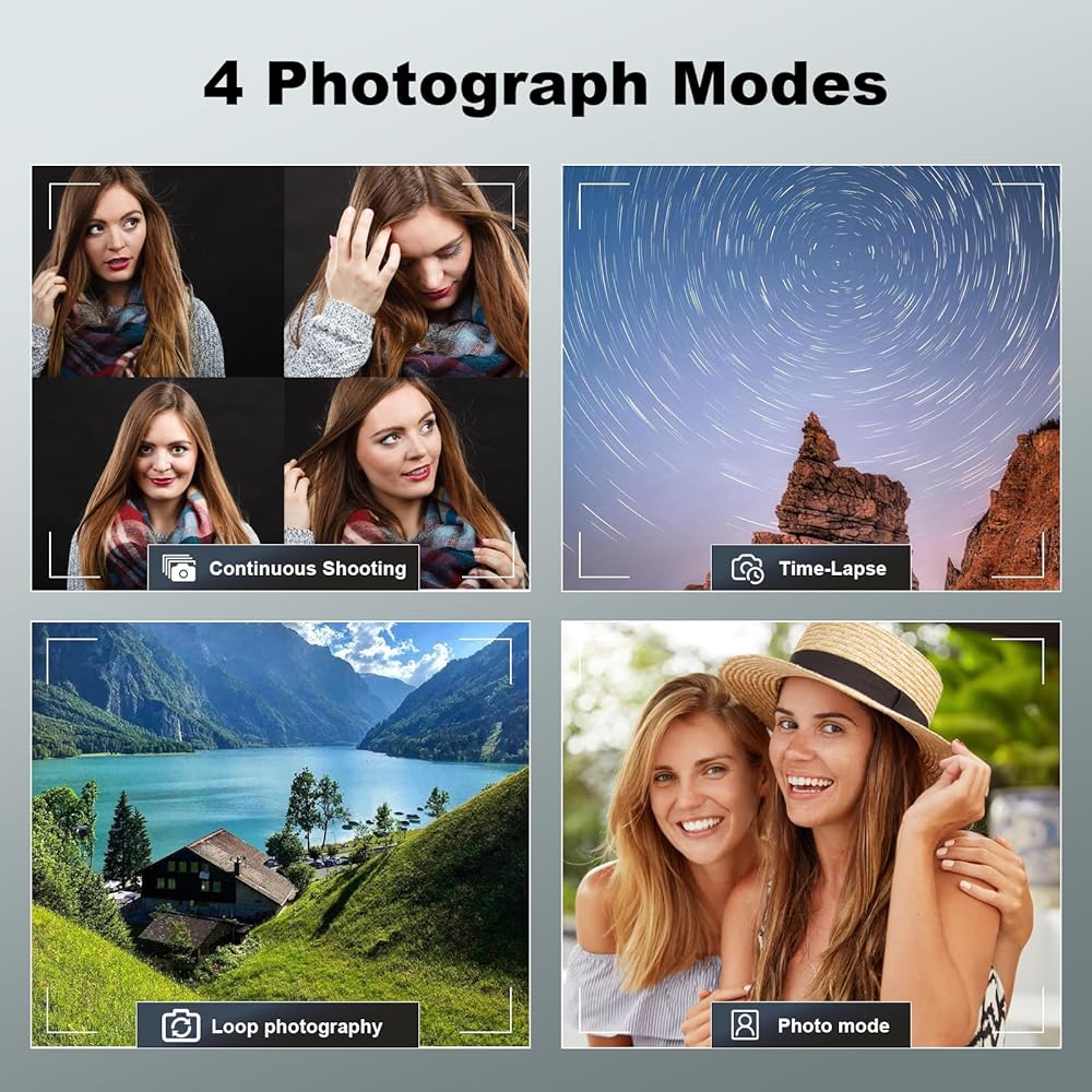 【أوضاع تصوير متعددة الاستخدامات】: بالإضافة إلى الوظائف الأساسية، توفر كاميرا NBDDIGITAL سبعة أوضاع تصوير إضافية، بما في ذلك التصوير الفوتوغرافي بفاصل زمني، والتصوير الفوتوغرافي المتتابع، والتسجيل بسرعات متغيرة. سواء كنت مبتدئًا أو متحمسًا، فهذه الكاميرا تلبي جميع احتياجاتك الإبداعية.