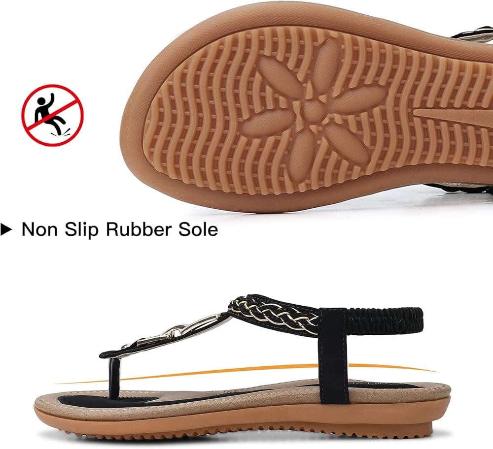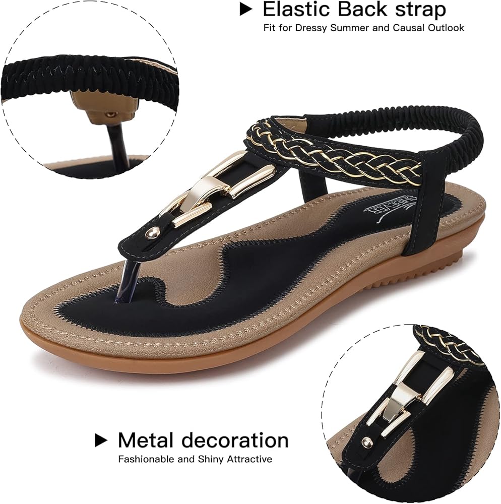 صنادل مريحة للنساء: أحذية نسائية مريحة للمشي مع مظهر أنيق مثل طراز بوهو، زخرفة معدنية لامعة، حزام على الكاحل، مشبك عند الأصابع.