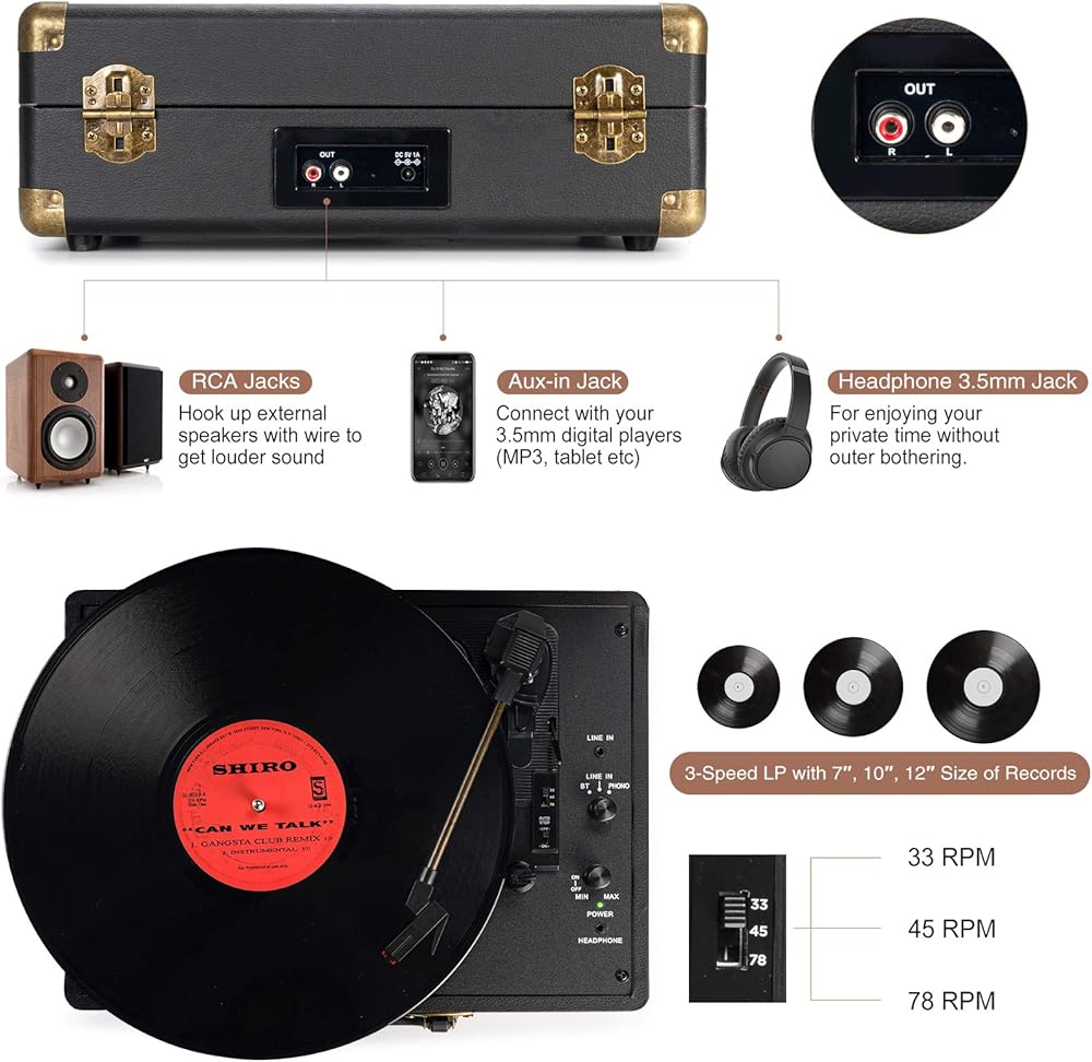 【FOUR AVAILABLE CONNECTION CHOICES】Music streaming digital audio via turntable built-in Bluetooth speakers. Hook up external speakers through RCA output or Aux-in line for non-Bluetooth devices like MP3. You can use your headphones to get private listening. Just seize the day with music