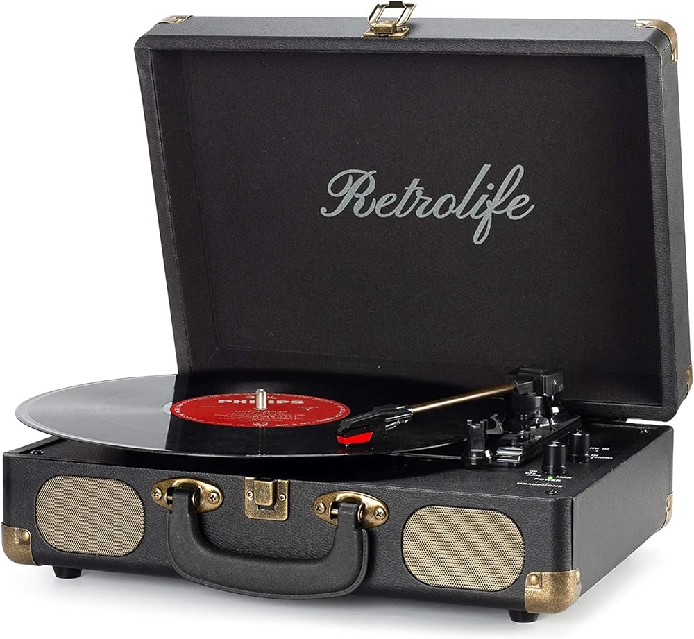 【Retrolife INDIVIDUAL SUITCASE RECORD PLAYER】A satisfying combo of modern and vintage elements. Black classic PU leather outlook with retro bronze metal screws and nets, you can take it everywhere with its solid handle. Be ready to create your own music memories