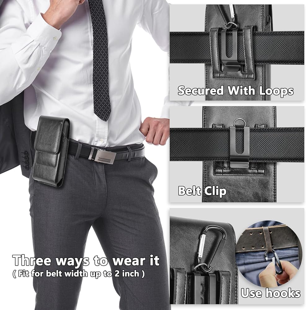 4 Ways to wear: This phone belt holder provides 4 ways to wear , you can either simply slide and clip it on the waistband of pants using belt clip , use double belt loops in position or horizontal positon . Hanging cell phone pouch with ring hook