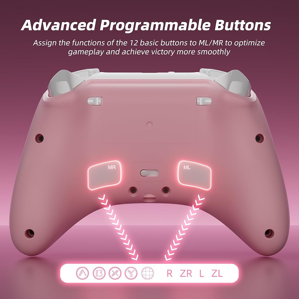 وحدة تحكم Mytrix اللاسلكية الاحترافية مع قاعدة شحن، وحدات تحكم لأجهزة Nintendo Switch/PC/Steam/iPad/Mac/الكمبيوتر اللوحي/الكمبيوتر المحمول، مع ضوء RGB/مفاتيح ماكرو/زر توربو/4 بدائل لعصا التحكم، وردي ساكورا