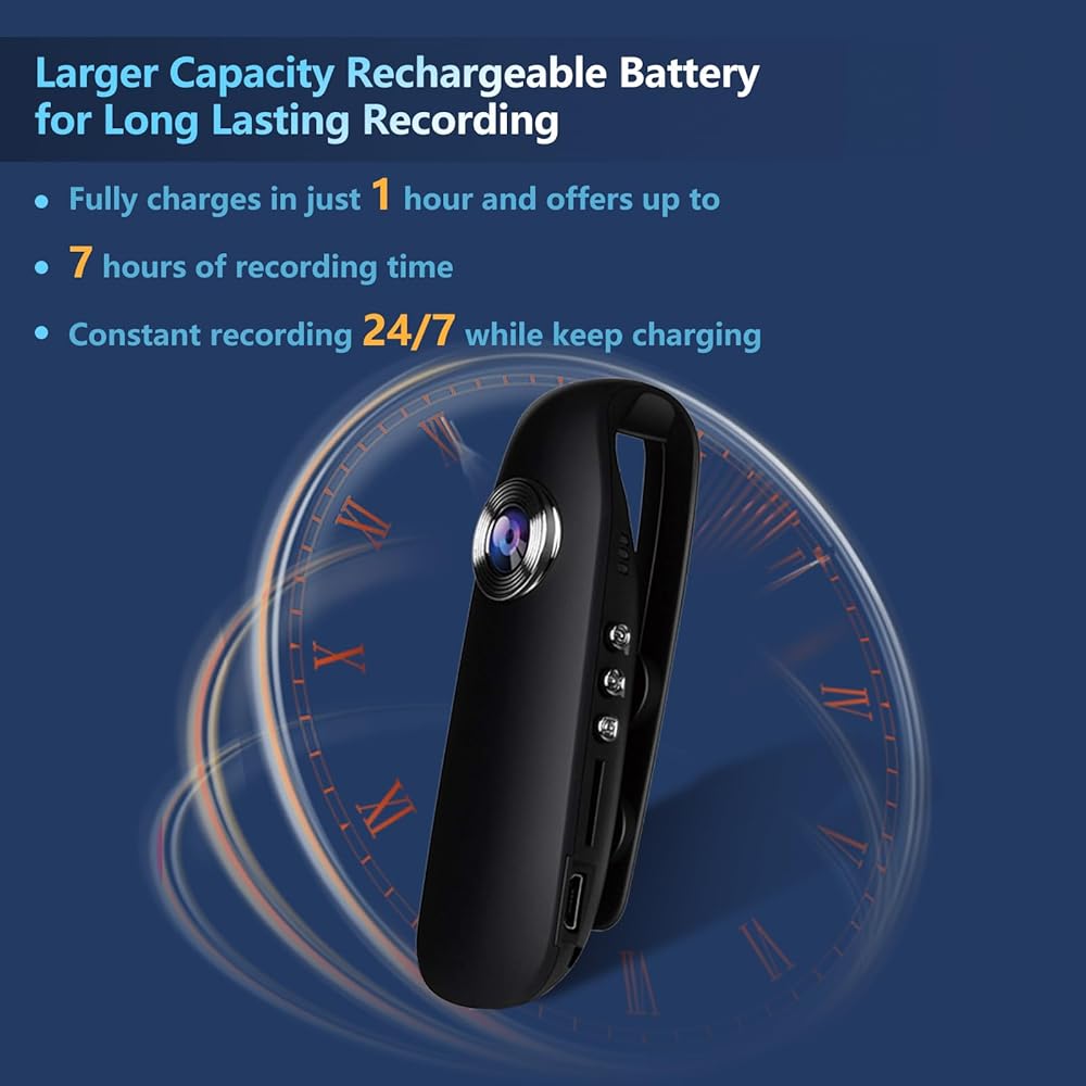 استخدام لاسلكي لمدة 3-7 ساعات وتشغيل طوال اليوم أثناء الشحن: احصل على 3-7 ساعات من الاستخدام اللاسلكي مع البطارية المدمجة القابلة لإعادة الشحن بقدرة 560 مللي أمبير في الساعة. للاستخدام الممتد، يمكن أن تعمل كاميرا الجسم المدمجة هذه بشكل مستمر عند توصيلها ببنك الطاقة أو الكمبيوتر، مما يضمن تغطية متواصلة