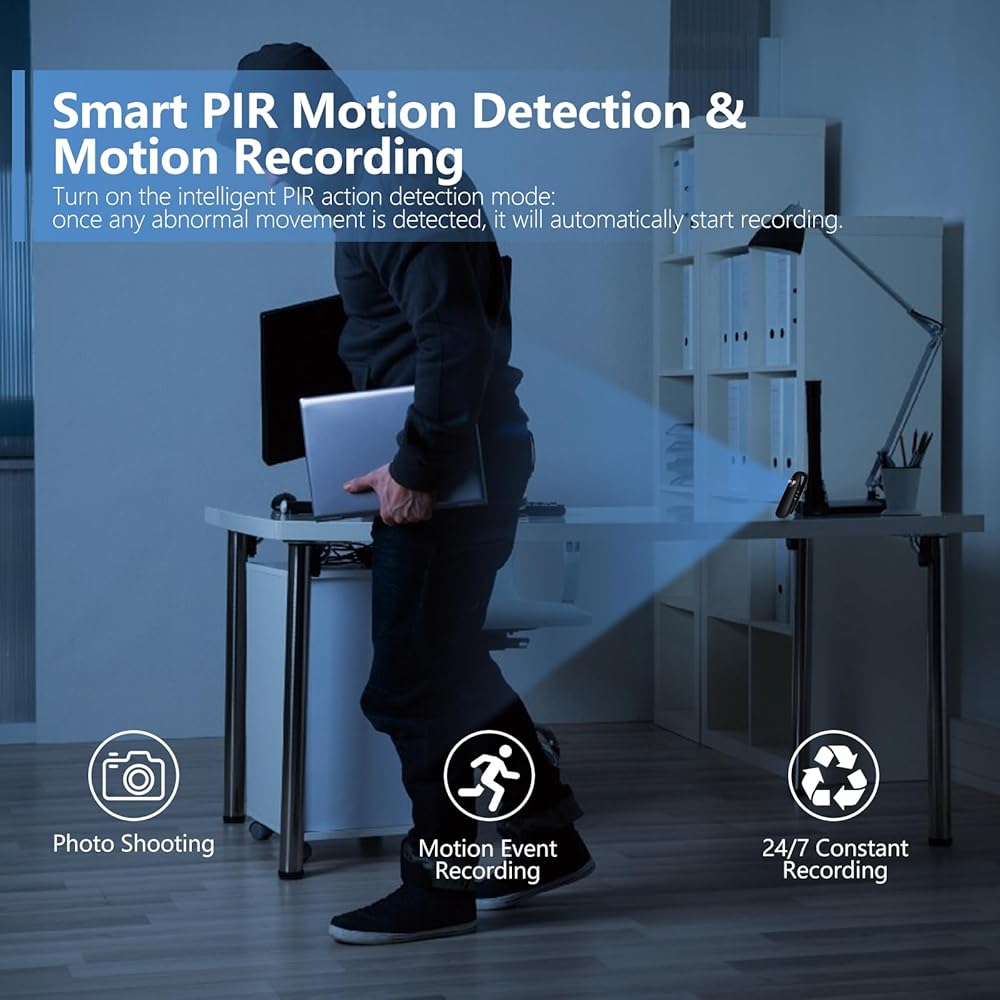كشف الحركة الذكي PIR: يتم تنشيط المستشعر المدمج المتقدم عند اكتشاف الحركة، مما يضمن لك التقاط كل حدث دون فقدان اللحظات المهمة.