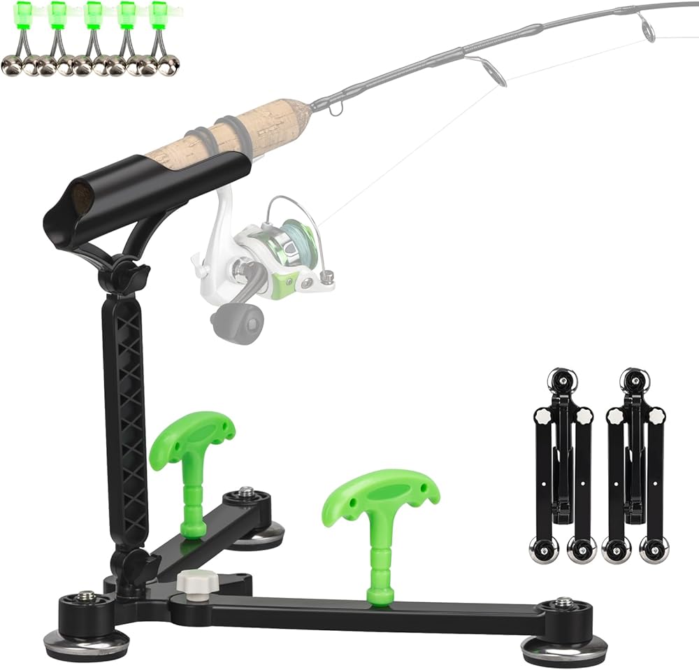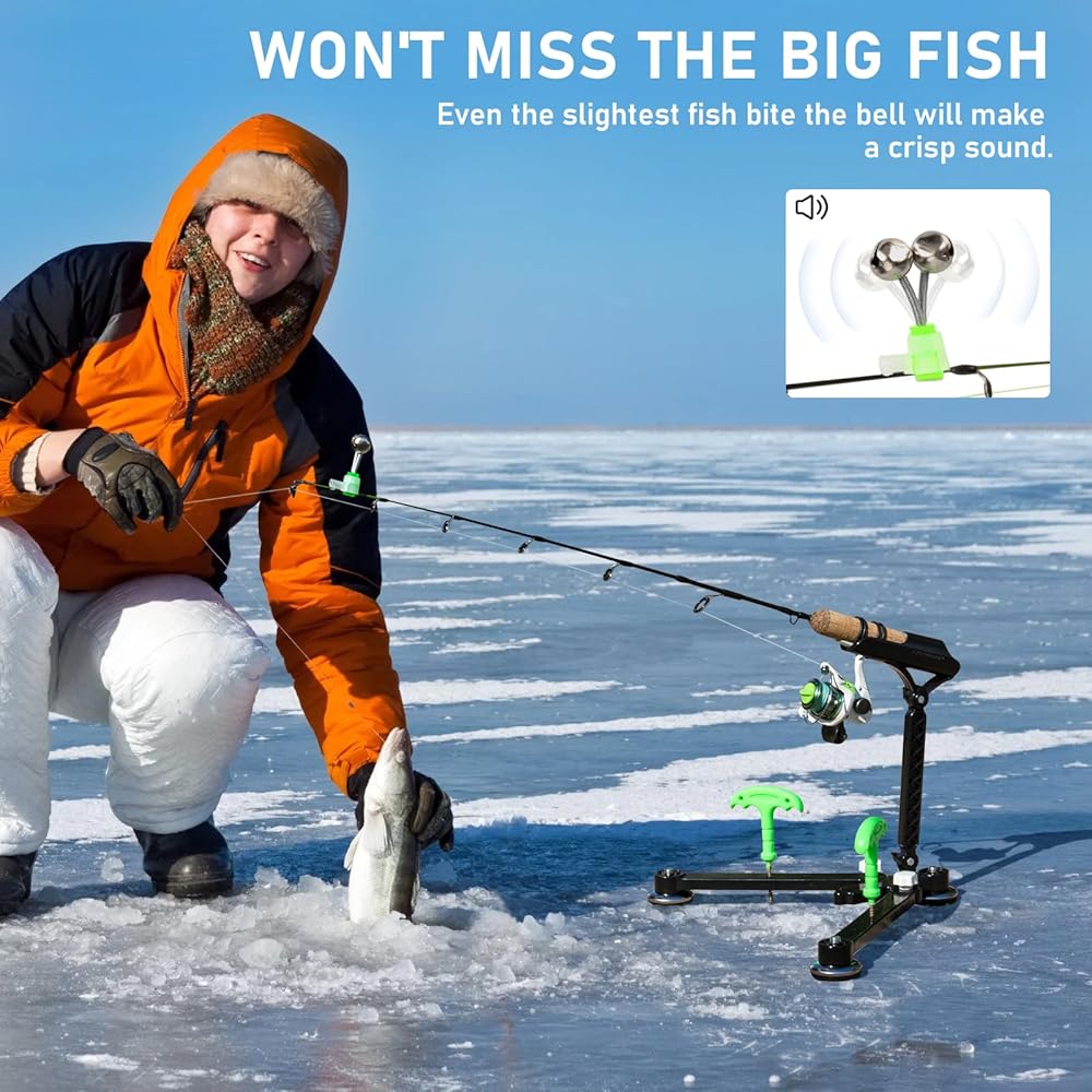 • مجهزة بتذكيرات الجرس: كل حامل صنارة صيد لصيد الأسماك على الجليد مجهز بـ 5 أجراس صيد لتذكيرك بوجود سمكة تعض الطعم. يمكنك تثبيت جرس الصيد على طرف صنارة الصيد الجليدية، وحتى أدنى قضمة سمكة ستصدر صوتًا واضحًا، مما يمنعك من تفويت الأسماك الكبيرة