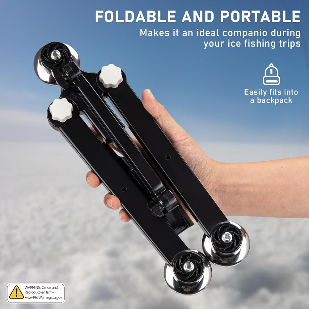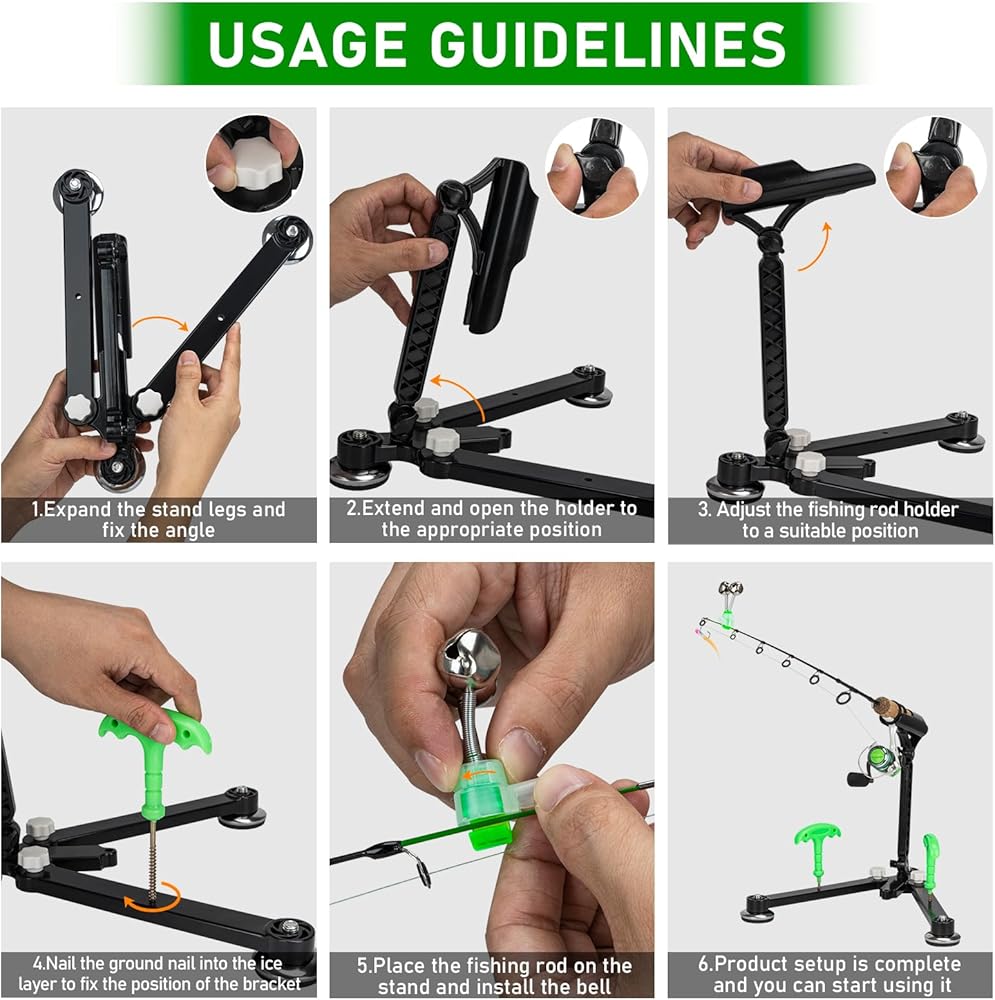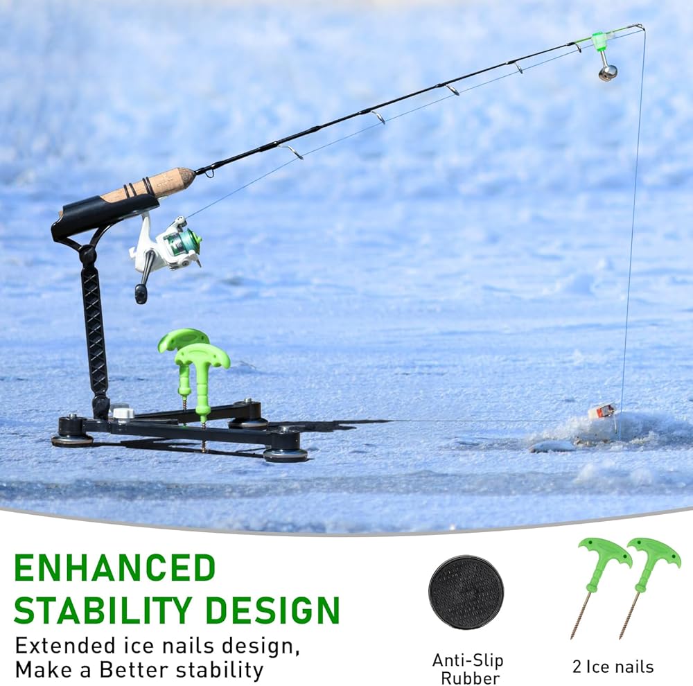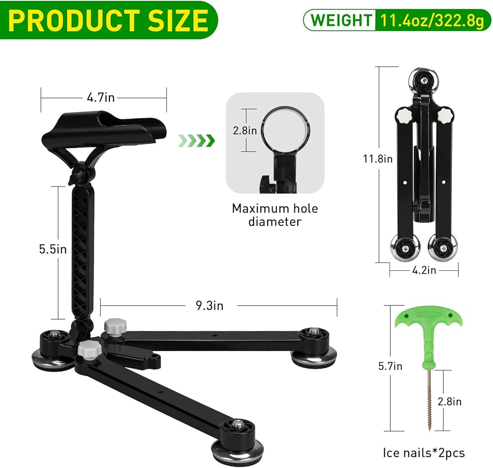 • تصميم ثبات معزز: يتميز طرف الصيد على الجليد هذا بهيكل مثلث عند فتحه، مما يوفر أقوى ثبات. تمت إضافة الجزء السفلي من حامل القضيب بتصميم حبيبي مضاد للانزلاق، وكل رف لقضيب صيد الجليد مجهز بـ 3 مرساة ثلجية. يمكنك تثبيت مثبتات الجليد في طبقة الجليد من خلال الفتحات المحفوظة على حامل صنارة صيد الجليد. يمكن إدخال المراسي في طبقة الجليد بمقدار 1.7 بوصة في الأسفل لمنع حامل صنارة الصيد من الانزلاق