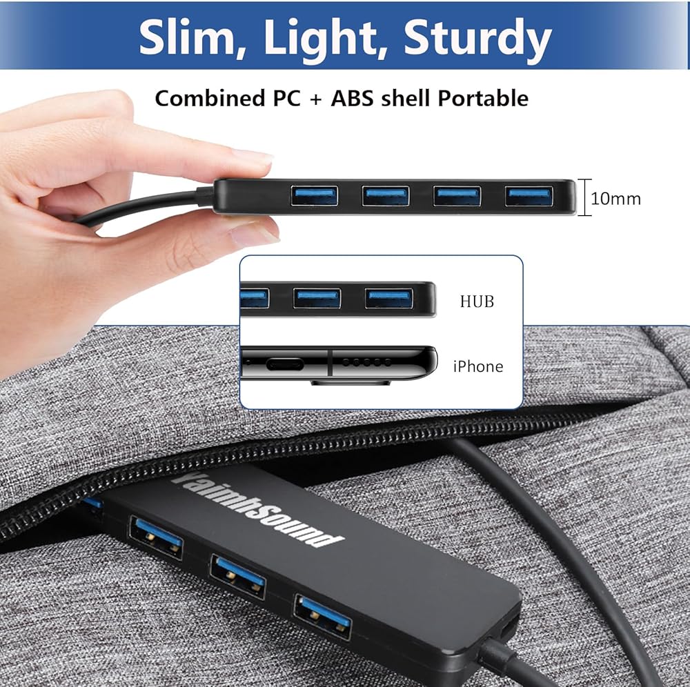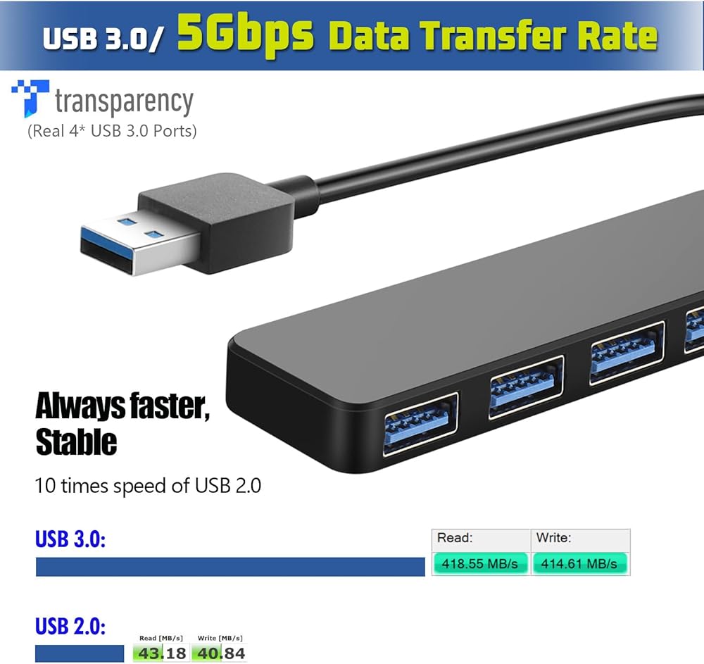 * سرعة USB3.0 فائقة: مع USB3.0 عالي الكفاءة، يوفر مقسم USB ذو 4 منافذ T-Sound نقل بيانات ثابت بسرعة 5 جيجابت في الثانية ويتوافق مع 2.0/1.0. تم اختبار سرعة القراءة والكتابة عند 371.19 ميجابايت/ثانية، و245.97 ميجابايت/ثانية مع جهاز USB3.0، و43.18 ميجابايت/ثانية، و40.84 ميجابايت/ثانية مع جهاز USB2.0.