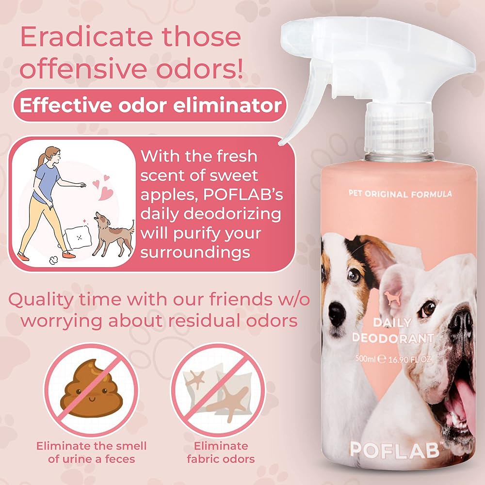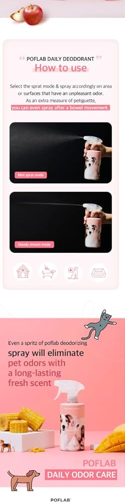 رائحة مبهجة: يتميز رذاذ مزيل الروائح الكريهة للحيوانات الأليفة لدينا برائحة منعشة تجمع بين قاعدة التفاح المنعشة ورائحة الأزهار الرقيقة. هذه الرائحة المبهجة ستبقي رائحة صديقك ذو الفراء نظيفة ومنعشة لساعات طويلة دون أن تطغى على أنفه الحساس.