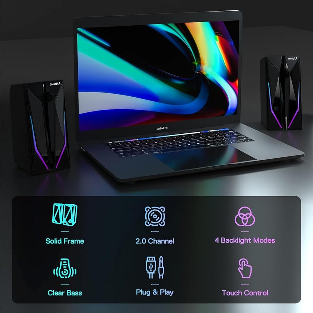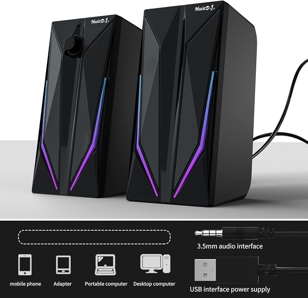 مكبرات صوت لسطح المكتب، مكبر صوت هاي فاي ستيريو للألعاب للكمبيوتر الشخصي بقناة 2.0 مع أوضاع إضاءة LED ملونة، وجهير محسن وتحكم سهل في مستوى الصوت، مزود بمنفذ USB مقاس 3.5 مم.