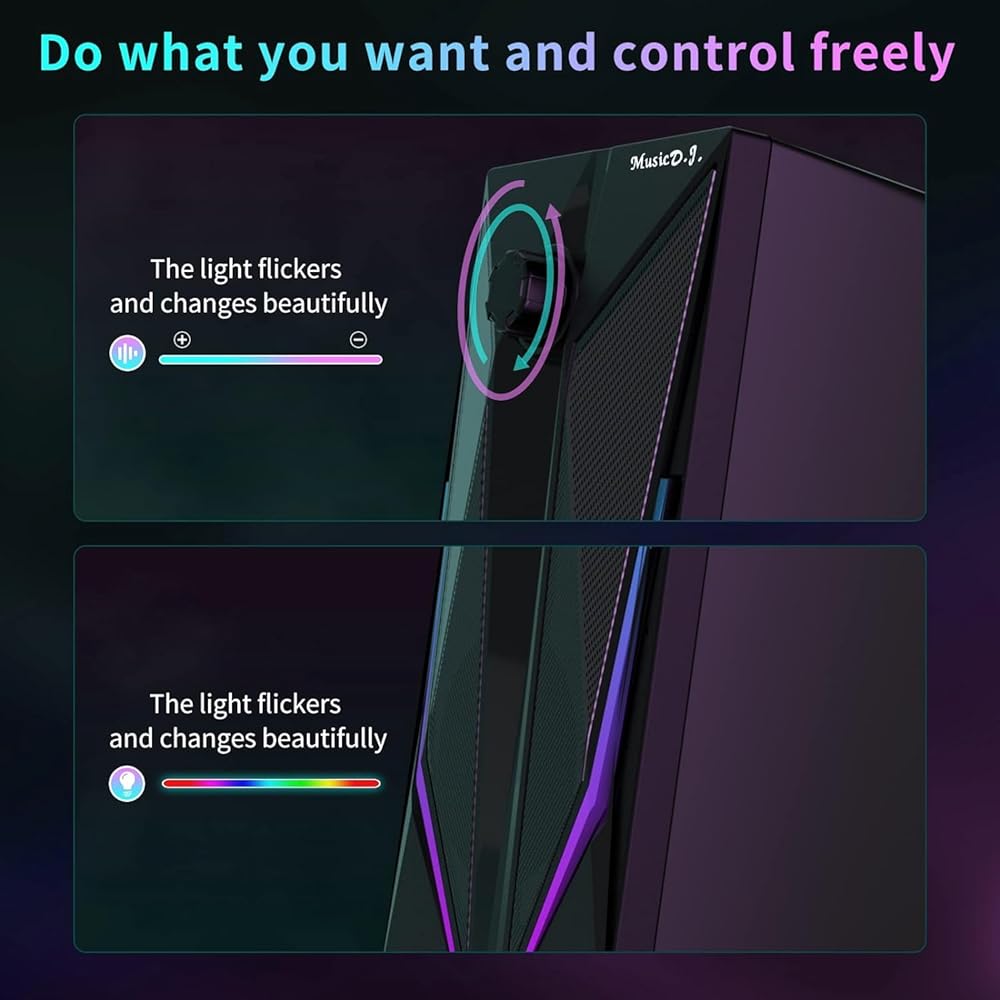 【RGB Lighting 】6 lighting modes - Symphony, Flow, and 4 monochromatic options, are designed for pc speakers, to personalize your desktop and enhance your gaming and auditory experience.