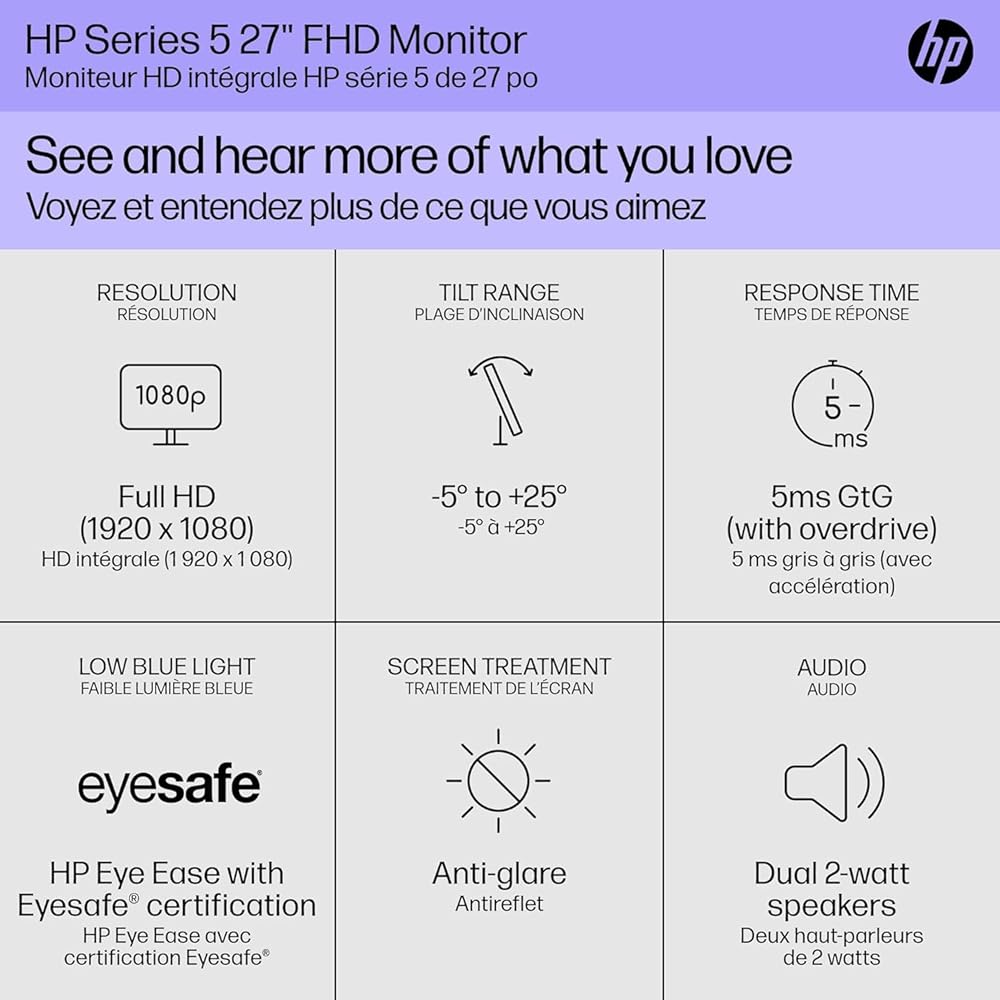 The HP Series 5 27 inch FHD Monitor delivers exceptional performance and stunning visuals, making it an excellent choice for anyone seeking top-quality 27 inch monitors. With a Full HD display (1920 x 1080), this 27” monitor offers sharp, vibrant images perfect for work, gaming, or entertainment. Its advanced IPS panel ensures consistent color accuracy and image clarity from virtually any viewing angle, making it one of the most versatile monitors 27 inch users can own. This 27in monitor is engineered to enhance your visual experience with a 99% sRGB color gamut, providing rich, lifelike colors for professional and personal use. The 1500:1 contrast ratio adds depth and detail to your images, while the 300 nits brightness ensures clarity even in well-lit environments. These features make this 27 inch monitor a reliable choice for creative projects, gaming setups, or general productivity. Comfort is key with the HP Series 5, thanks to its Eye Ease technology with Eyesafe Certification. This technology reduces harmful blue light emissions without compromising visual quality, making it a standout pc monitor 27 inch for extended use. Whether you need a monitor 27 inch for your office or a monitor 27inch for your gaming station, this model adapts effortlessly to your needs. Designed for style and function, this sleek monitor 27+ inch fits seamlessly into any setup. Whether you're upgrading your home office or adding to your gaming station, the HP Series 5 27 in monitor combines aesthetic appeal with powerful performance. For those looking for monitors 27 inch or a monitor 27 inch that balances form and functionality, the HP Series 5 is the perfect choice.
