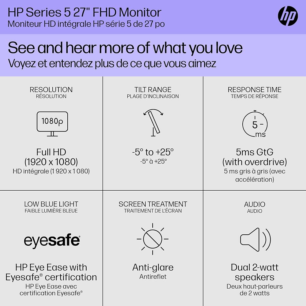 شاشة HP Series 5 مقاس 27 بوصة بدقة FHD، شاشة عالية الدقة بالكامل (1920 × 1080)، لوحة IPS، 99% sRGB، نسبة تباين 1500:1، 300 شمعة في المتر المربع، راحة العين مع شهادة Eyesafe، 527sa (متجددة)