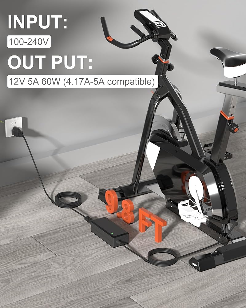 Replacement for Peloton Exercise Bike charger: output 12V 5A 60W (4.17A-5A compatible) Input AC 100V-240V, power cord length 9.8ft.This Peloton Bike Power Supply has been tested, please confirmed that it is compatible with the models we lised as below