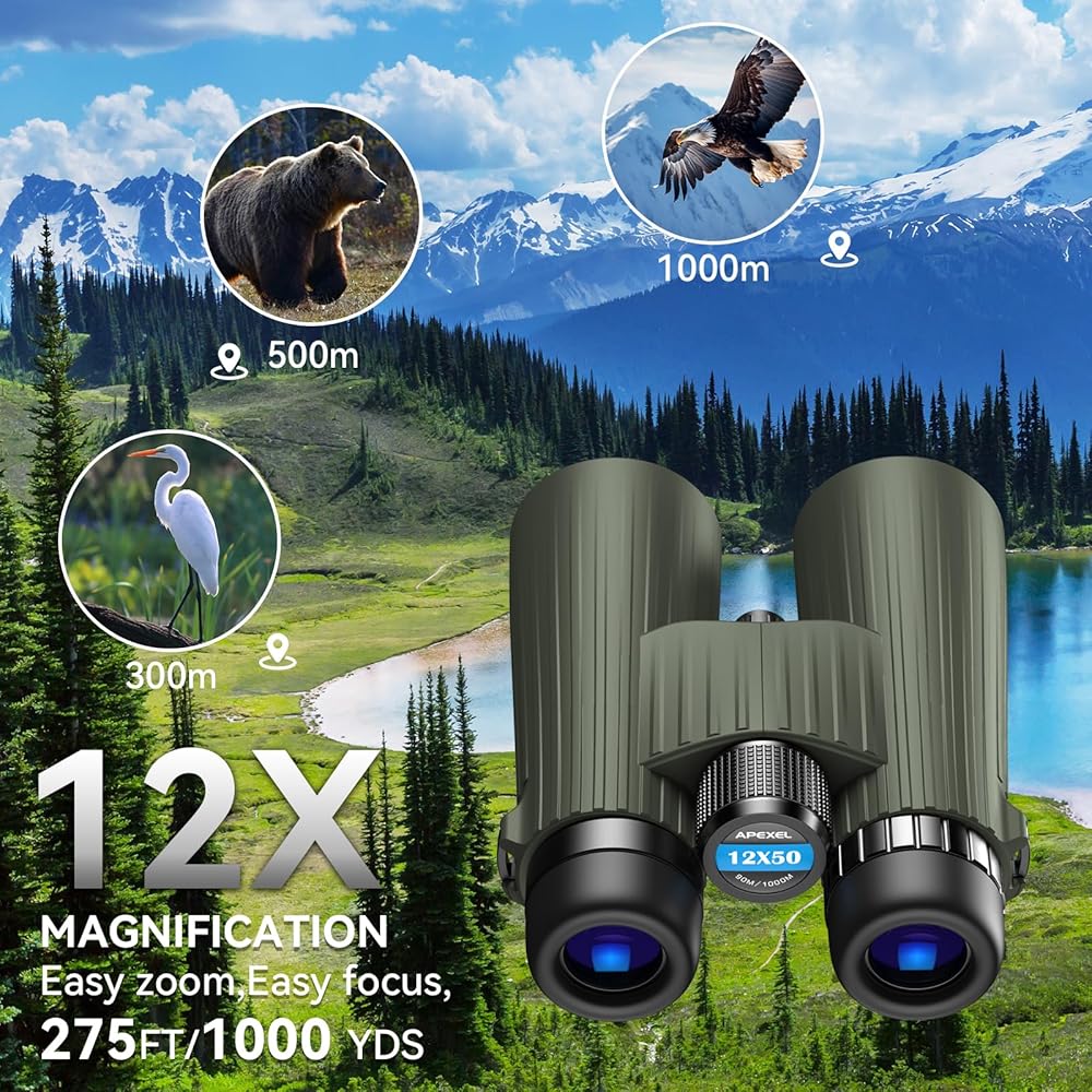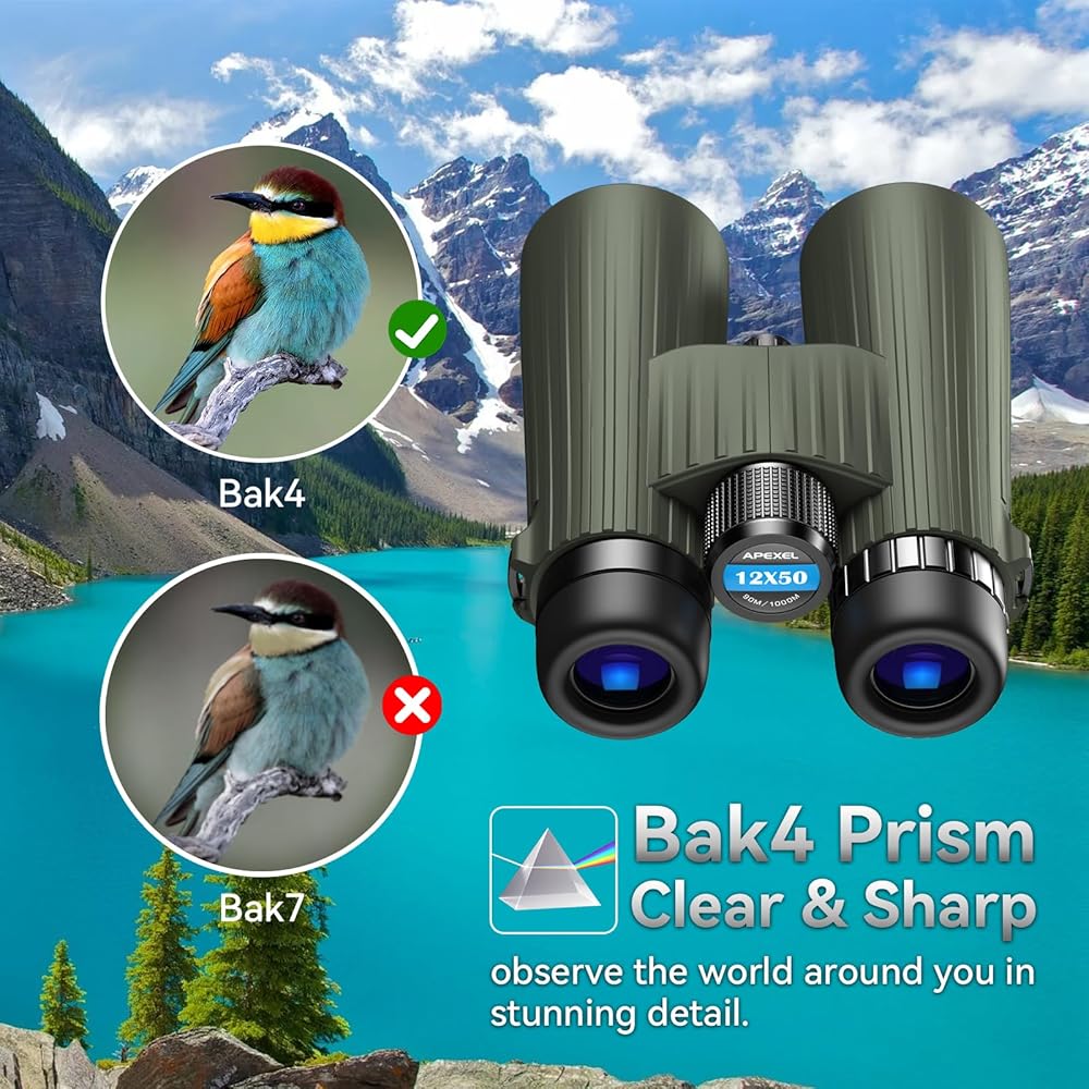 مناظير APEXEL 12X50 احترافية للبالغين مع محول هاتف، ومناظير بصرية عالية الطاقة مع منشور BaK4، ومناظير IPX7 مقاومة للماء والصدمات للصيد ومشاهدة الطيور والخارج والمشي لمسافات طويلة