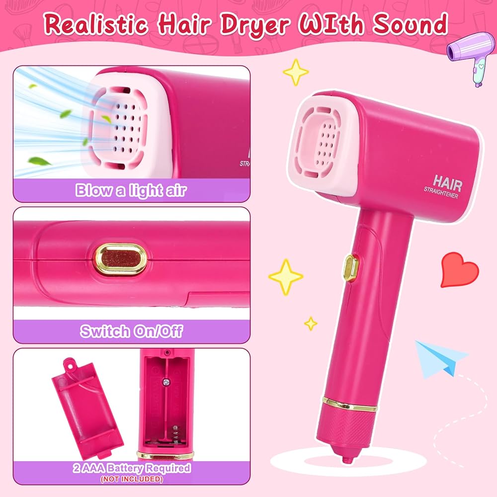 مجفف شعر واقعي - مجموعة شعر الفتيات التظاهرية هذه تحاكي مشهدًا حقيقيًا. يمكن لمجفف الشعر الذي يعمل بالبطارية أن يصدر ضوضاء وينفخ الهواء تمامًا مثل المجفف الحقيقي. (ملاحظة: يلزم وجود بطاريتين AAA. غير متضمنة). مجموعة أدوات اللعب مصنوعة من بلاستيك ABS الفاخر، آمنة وخفيفة الوزن. يمكن لأطفالك حمل لعبة مصفف الشعر هذه واستخدامها بسهولة.