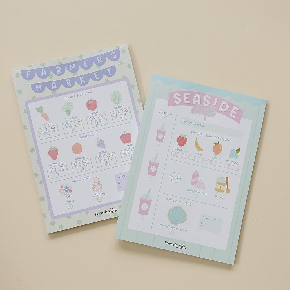 The Farmer's Market and Seaside Café Pretend Play Notepad Set is designed to provide hours of interactive and educational fun for toddlers, kids, and children who love playing grocery store and café owner. This playset allows boys and girls to use their imagination and creativity as they role-play running their own farmer's market produce stand and seaside café. With toy fruits, vegetables, and a pretend café menu, children can shop for fresh produce, take orders, and serve customers. The set encourages children to create their own grocery lists, take café orders on the ordering pad, and process payments using a pretend cash register. Perfect for indoor or outdoor play, this role-play set offers a lifelike experience for little ones. Whether it's running a fruit and vegetable stand, serving food at the seaside café, or preparing a delicious pretend meal, this set helps children develop important social, communication, and money-handling skills. It also teaches the basics of running a small business, from managing cash register transactions to organizing orders. This set is ideal for toddlers and preschoolers, offering a rich learning experience through imaginative play. In addition to fostering cognitive development, this set is great for teaching kids about healthy eating habits, as they pretend to buy and sell fruits and vegetables at the farmer's market. Children can act as market vendors, café owners, or even chefs, using their toy kitchen and register to bring their market and café to life. It's perfect for boys, girls, toddlers, and children of all ages who enjoy creative play, whether it's at home, school, or daycare. The Farmer's Market and Seaside Café Pretend Play Notepad Set makes a great gift for any child who loves food toys, cash registers, play kitchens, and running their own market. It's the perfect birthday present or holiday gift for toddlers, preschoolers, and young children. Parents and educators will love how this set encourages interactive learning and imaginative fun while helping kids develop their fine motor skills, communication abilities, and entrepreneurial spirit.