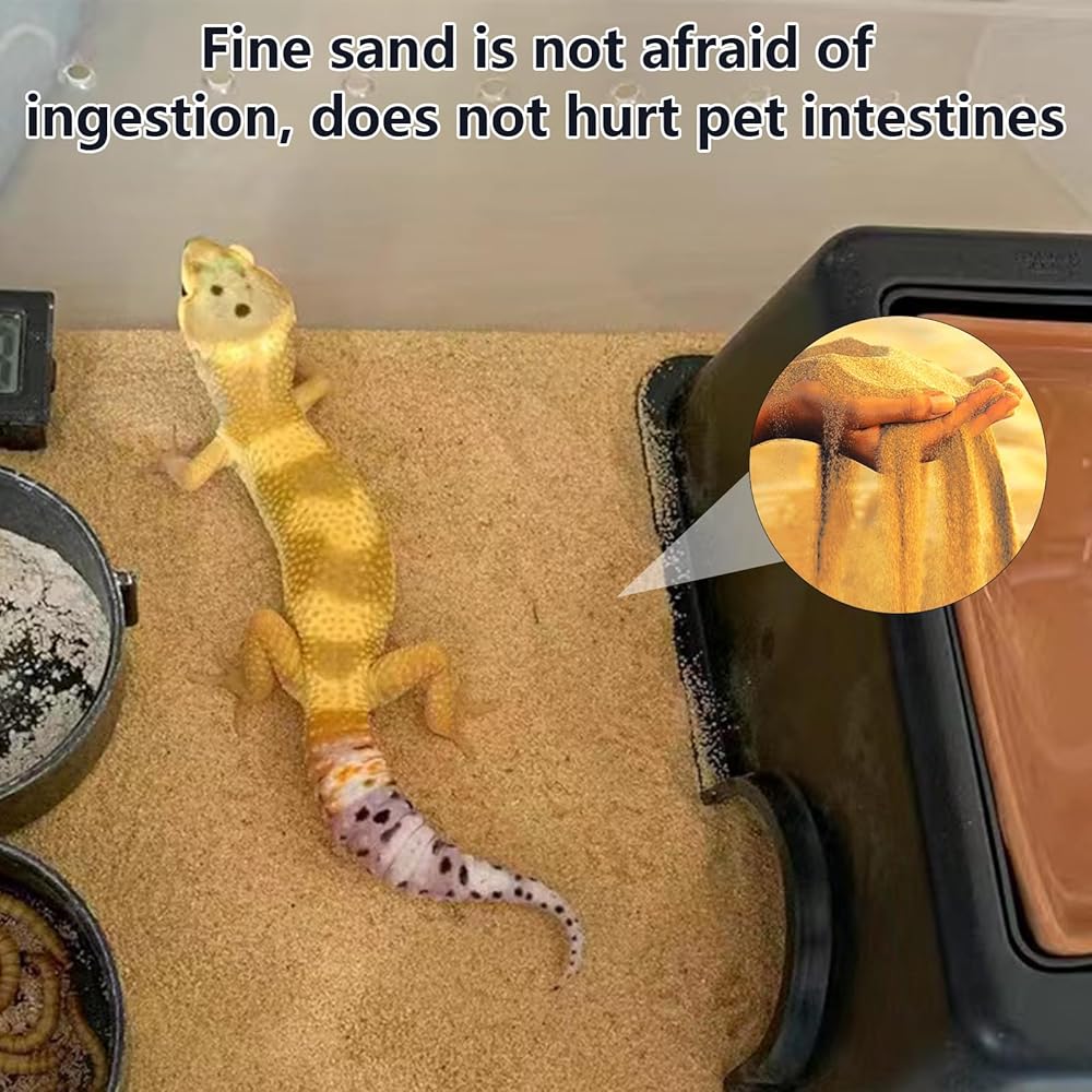 【مادة طبيعية】هذا الرمل الناعم للزواحف مصنوع من رمل طبيعي عالي الجودة، غني بالكالسيوم، مع ملمس طبيعي وآمن. قم بإنشاء موطن طبيعي وصحي للبرمائيات والزواحف.