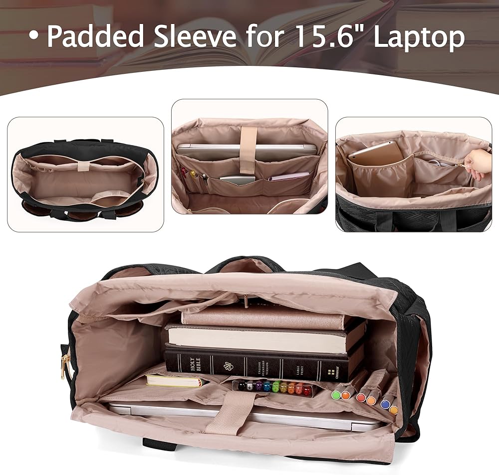 WELL ORGANIZED: There is a well-padded laptop compartment that can hold a 15.6 inches laptop or tablet. And it has 3 pen slots, 4 large internal pockets and 8 deep external pockets to sort and store the pens, highlighters, programs, workbooks, prayer lists, cards, phone, water bottle and other items needed for the church.