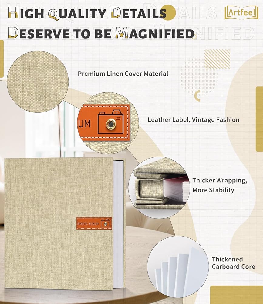 • 🔥جودة ممتازة: يتميز ألبوم الصور الخاص بنا بغطاء مغلف بالكتان عالي الجودة، يكمله ملصق جلدي بني كلاسيكي. يوفر إطار الورق المقوى القوي للألبوم هيكلًا ثابتًا. الصفحات الداخلية مربوطة بشكل آمن بأشواك قوية من الألومنيوم، مما يضمن بقائها ثابتة في مكانها دون أي خطر للانفصال.