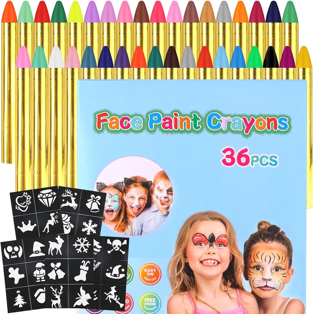 Value Pack: You will get 36pcs face painting crayons with 5 sheets stencil stickers in bright colors, no duplicates, each crayon is carefully crafted to deliver vibrant pigments that pop on any skin tone, providing endless possibilities for kids face and body painting