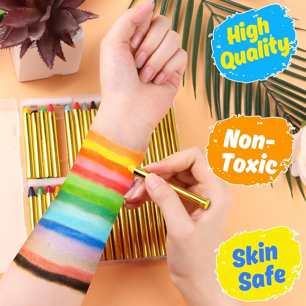 Safe Material: Face painting kit crafted from premium colour powder and crystal wax, these face paint crayons are non-toxic and skin-friendly, free from harmful elements, ensuring a safe and worry-free painting experience for kids