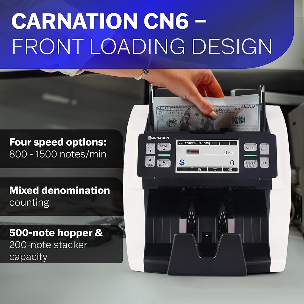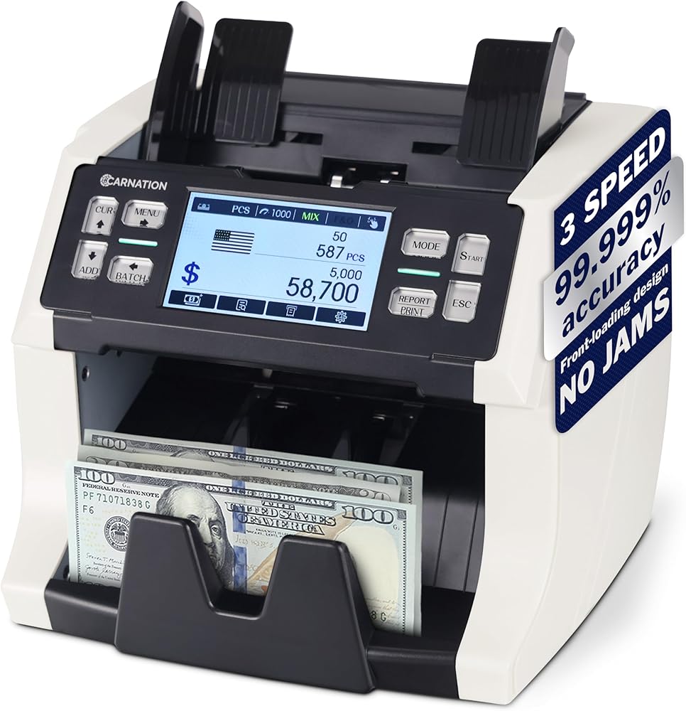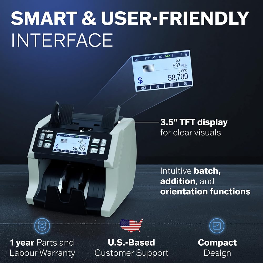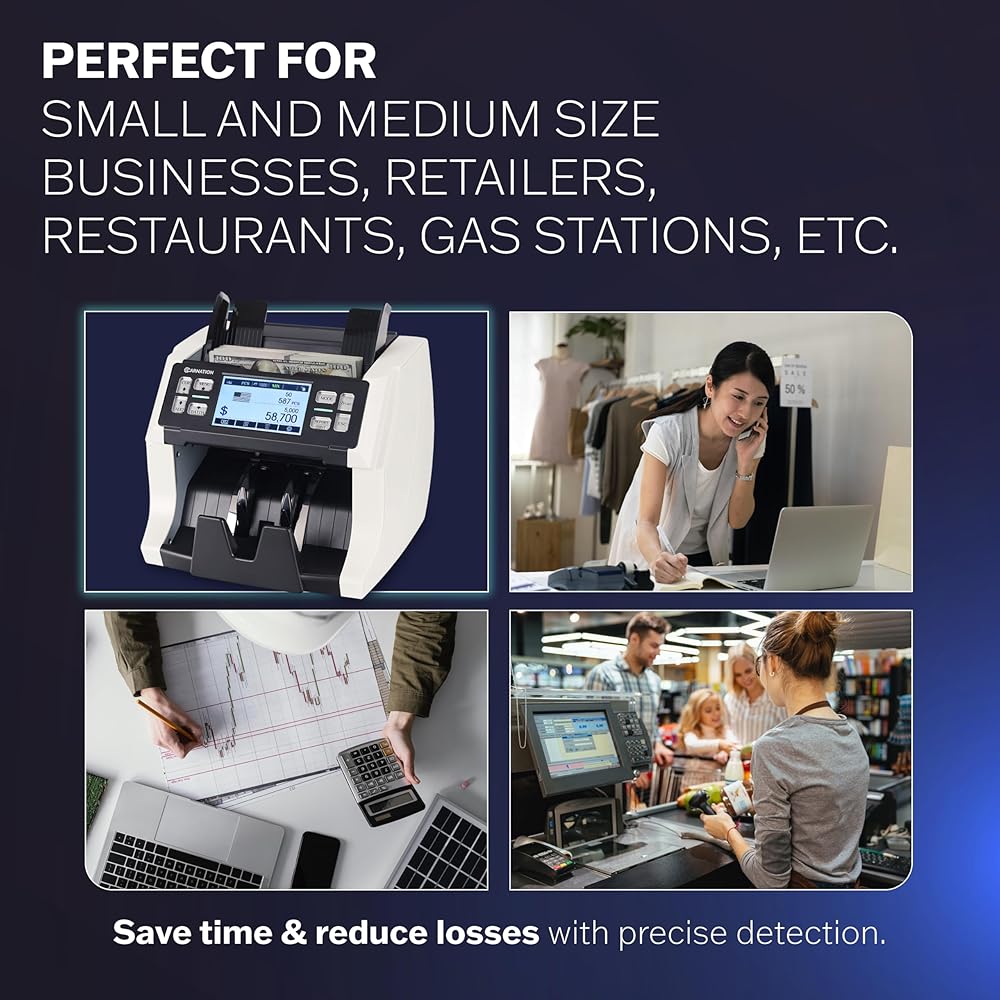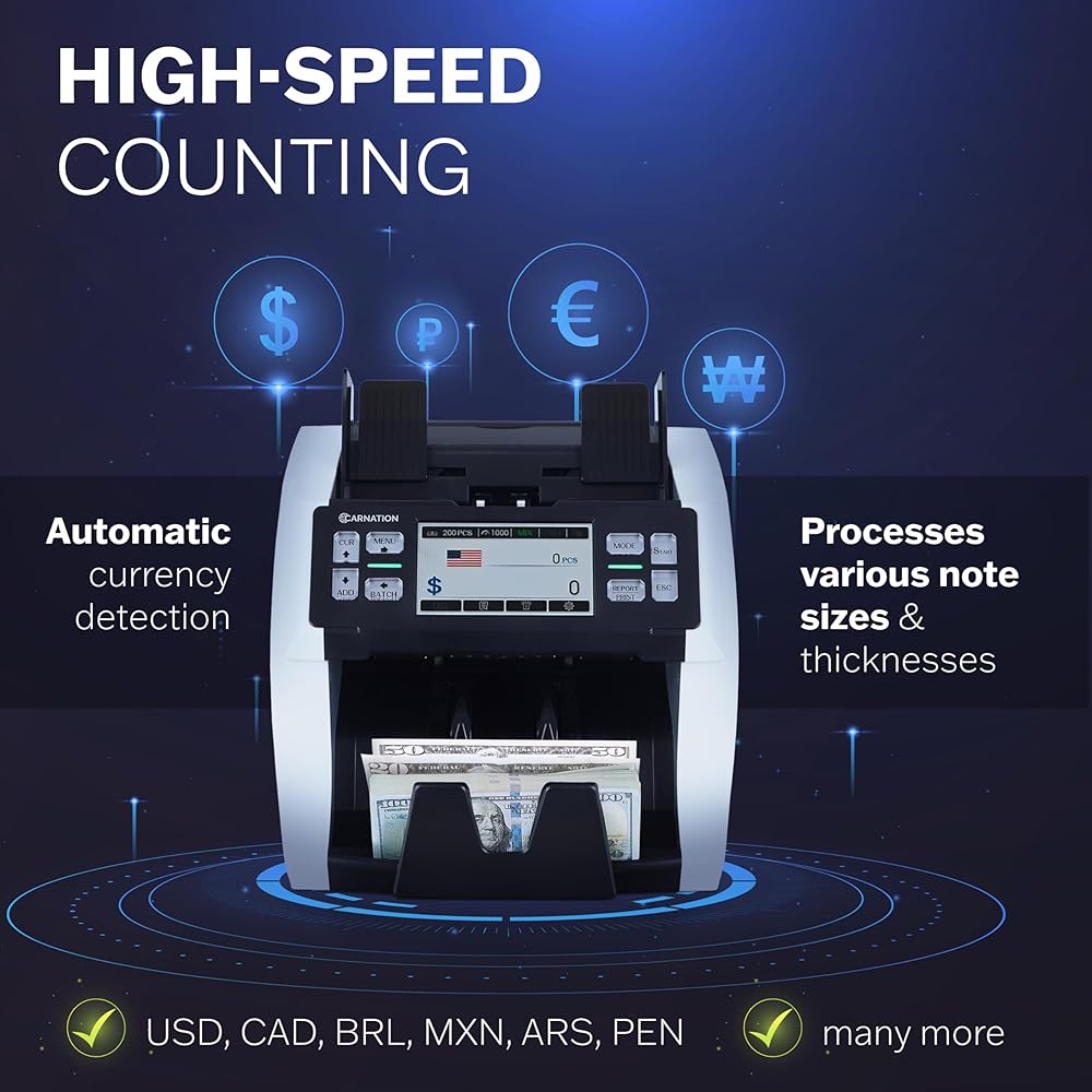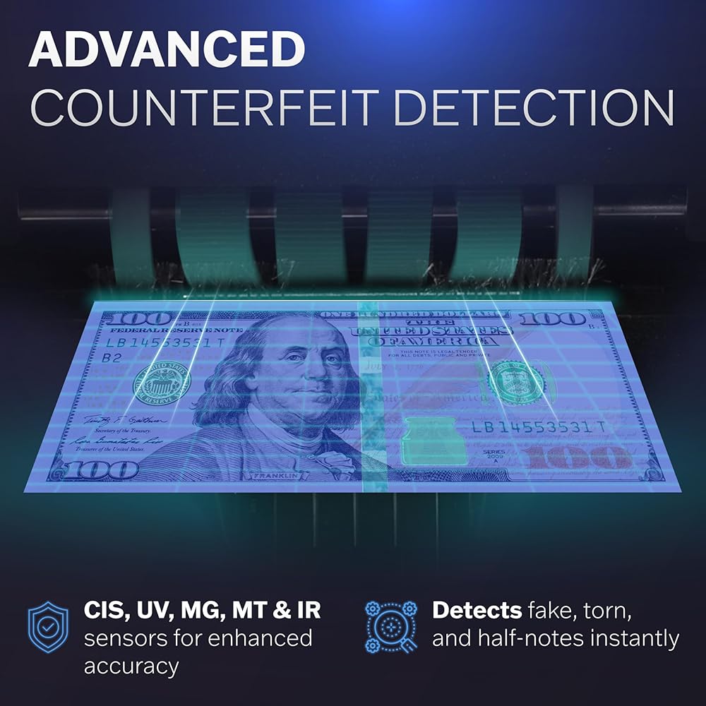 BILL COUNTER MACHINE WITH MULTI-CURRENCY SUPPORT : This money machine can handle up to 128 currencies, including USD, CAD, BRL, MXN, and more. It's designed for businesses that deal with multiple denominations, ensuring seamless currency recognition and accurate counting.