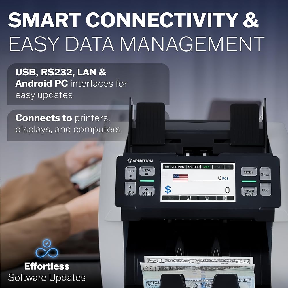 SOFTWARE UPDATABLE MONEY COUNT MACHINE : Stay up to date with the latest technology by easily updating the machine's software through U-disk, USB cable, or optional LAN. This ensures the cash machine counter remains reliable and can adapt to any new requirements or updates in currency recognition.