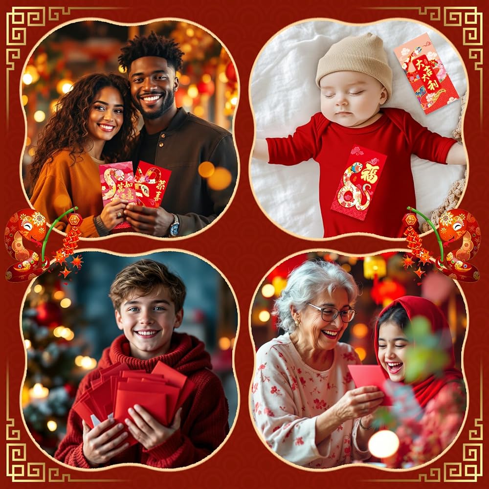 • تصميم ثعبان لطيف: Hongbao مدمج مع أنماط ثعبان كرتونية وعناصر رقيقة، إبداعية واحتفالية للغاية، حزم أموال لطيفة للعام الجديد. فاجئ أصدقائك أو عائلتك بهذه الأظرف الحمراء الجذابة.